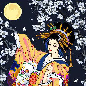 Japanese Geisha Under the Evening Blooms in Cross Stitch PDF Downloadable Pattern