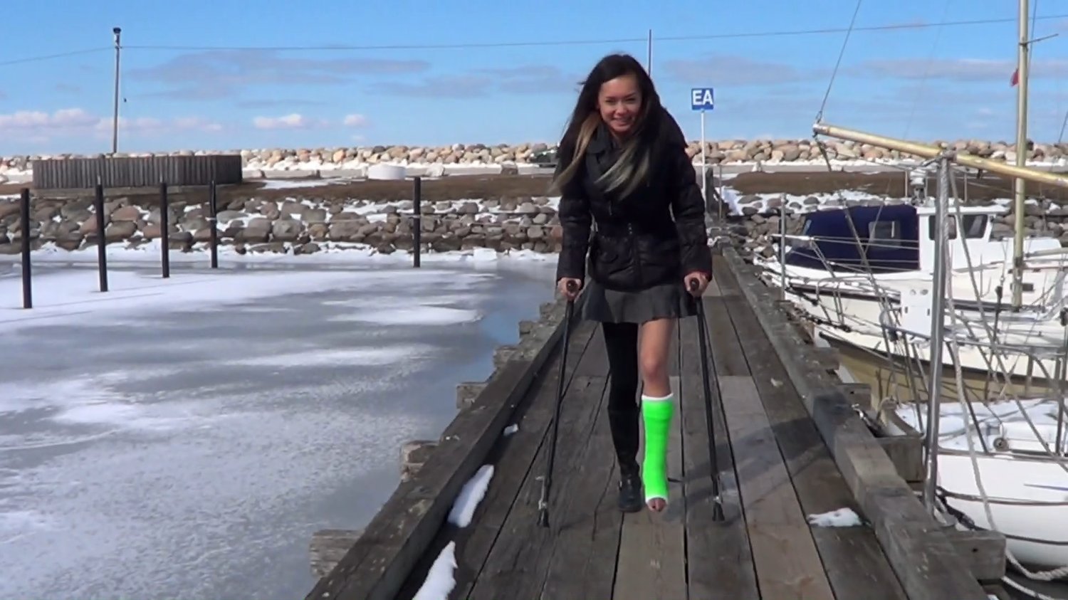 This is Bunny's first cast clip and we let her jump around on her crutches to learn how to use them but from the beginning she looks like a pro.Even though it is the middle of winter, Bunny has no protection for her toes and you can almost understand how cold it is where she goes down to a jetty with the snow lying on the ground and the frozen water where all boats usually lie in the summer