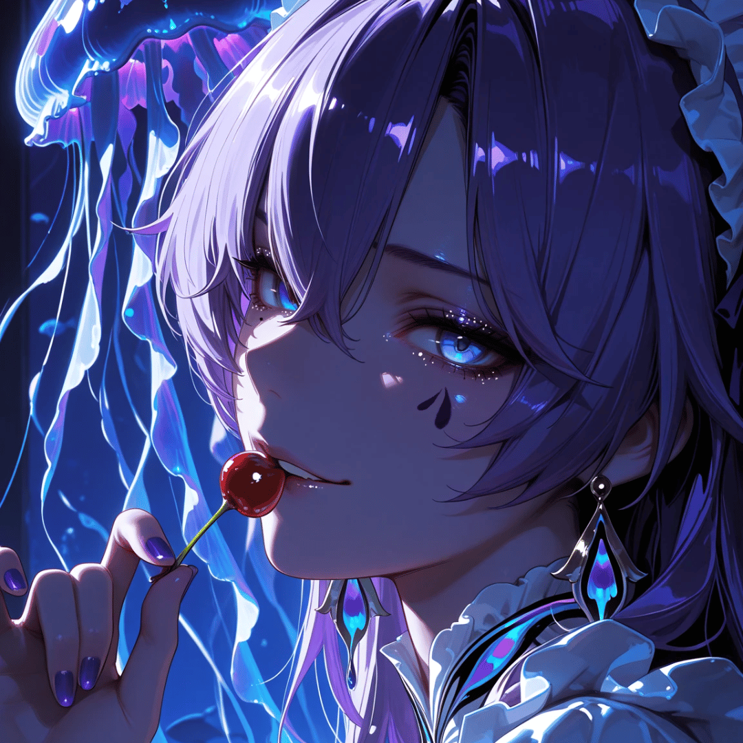 aquatic shadows across her elegant, high-tech attire. The cold luminescence highlights the sleek fabrics and metallic accents of her outfit, making her look like a queen presiding over an underwater domain.