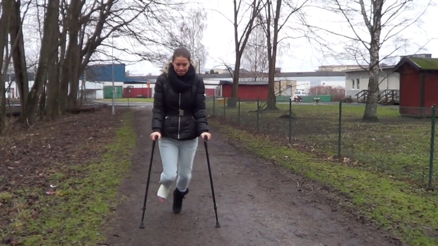 Sandy crutch from the parking lot onto the wet and muddy footpath down to the lake.On the way, she meets a man who asks her what she has done because her right leg is in an SLC.Sandy explains that she was out dancing when her foot gave way and that she now has to have the cast for 6 weeks.Then Sandy continues down to the lake to pose for us.