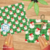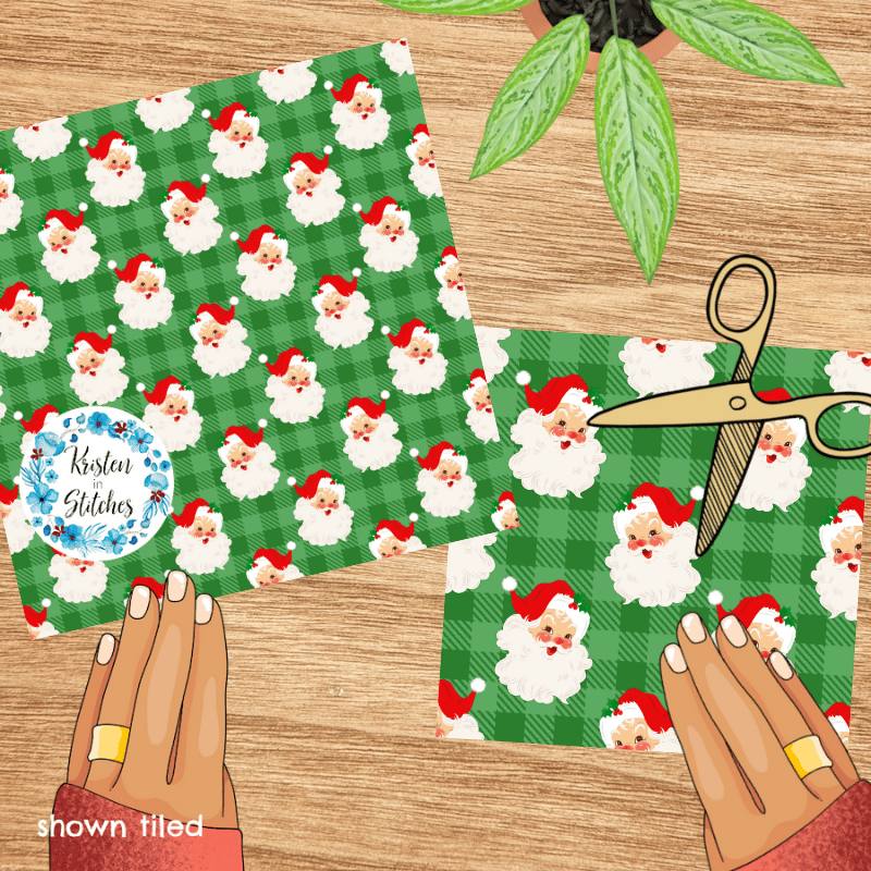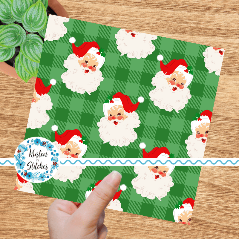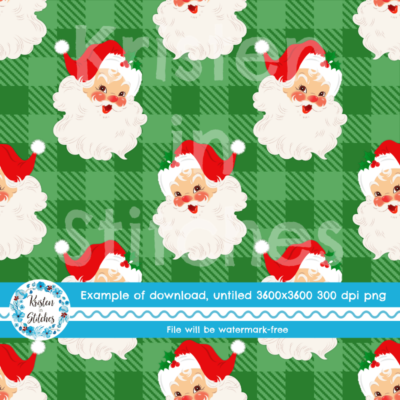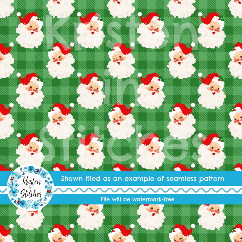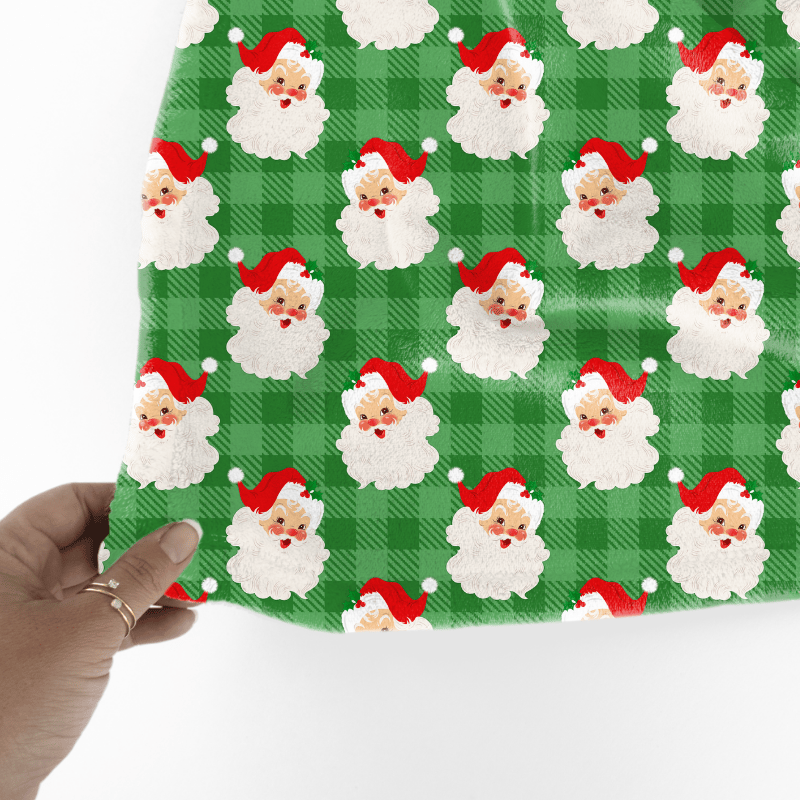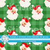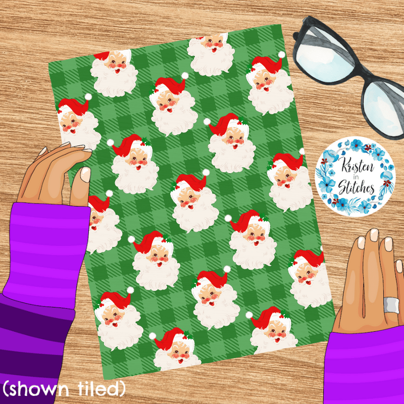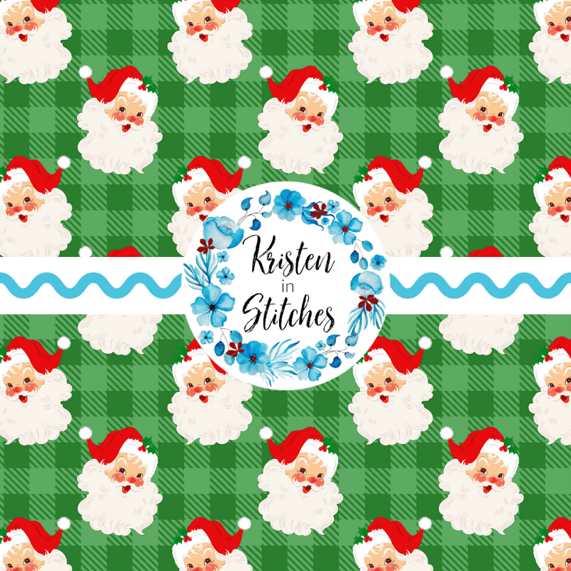 Retro Santa Claus faces with red hats on green buffalo plaid.
