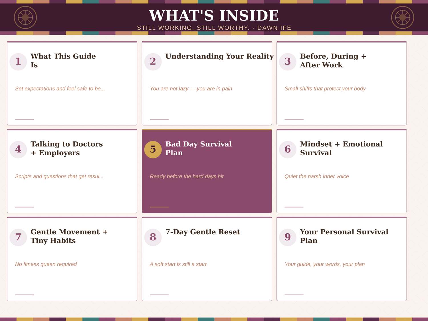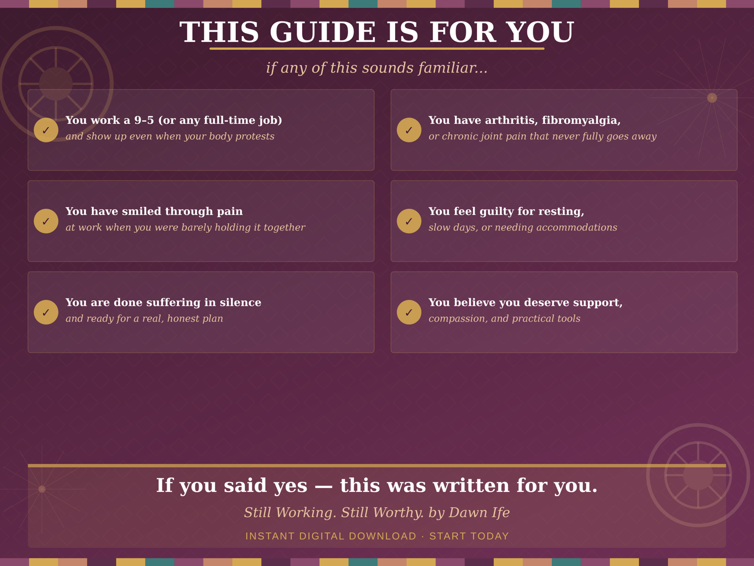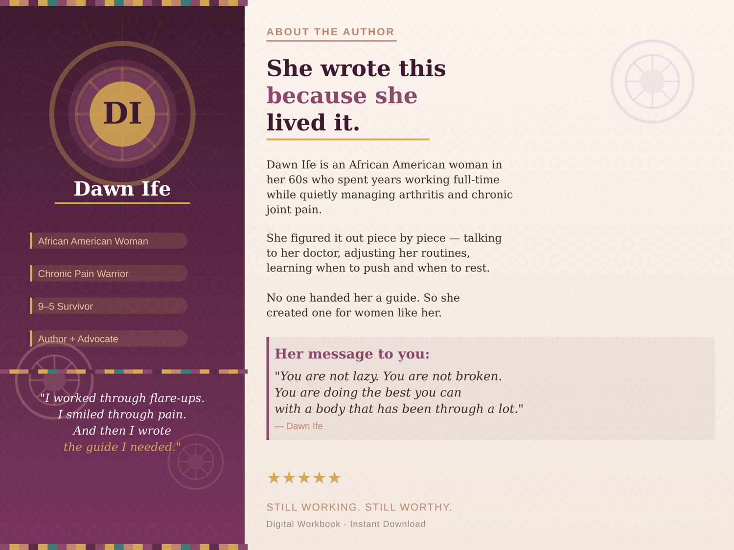 Still Working. Still Hurting. is a real-life survival guide for women living with arthritis, chronic joint pain, or fibromyalgia who are still showing up to their 9-5 every single day. Written by Dawn Ife — an African American woman who lived this — it is honest, practical, and full of compassion.