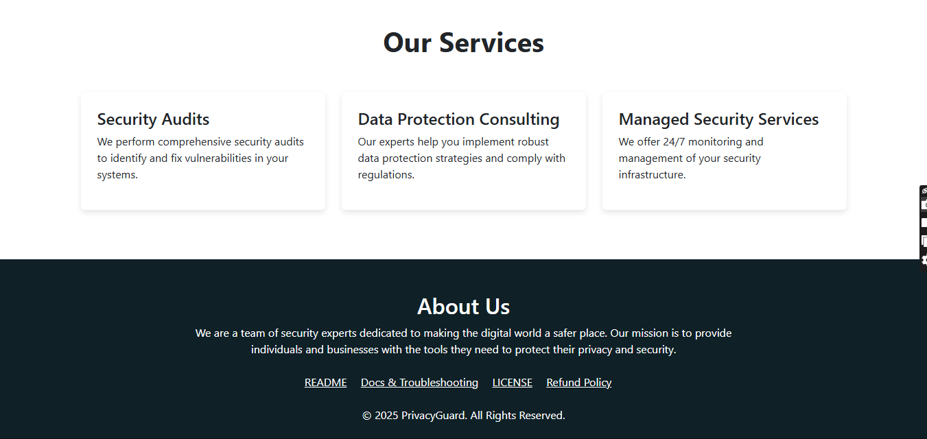 5. **About Us & Footer:** A comprehensive footer with company information and social links.