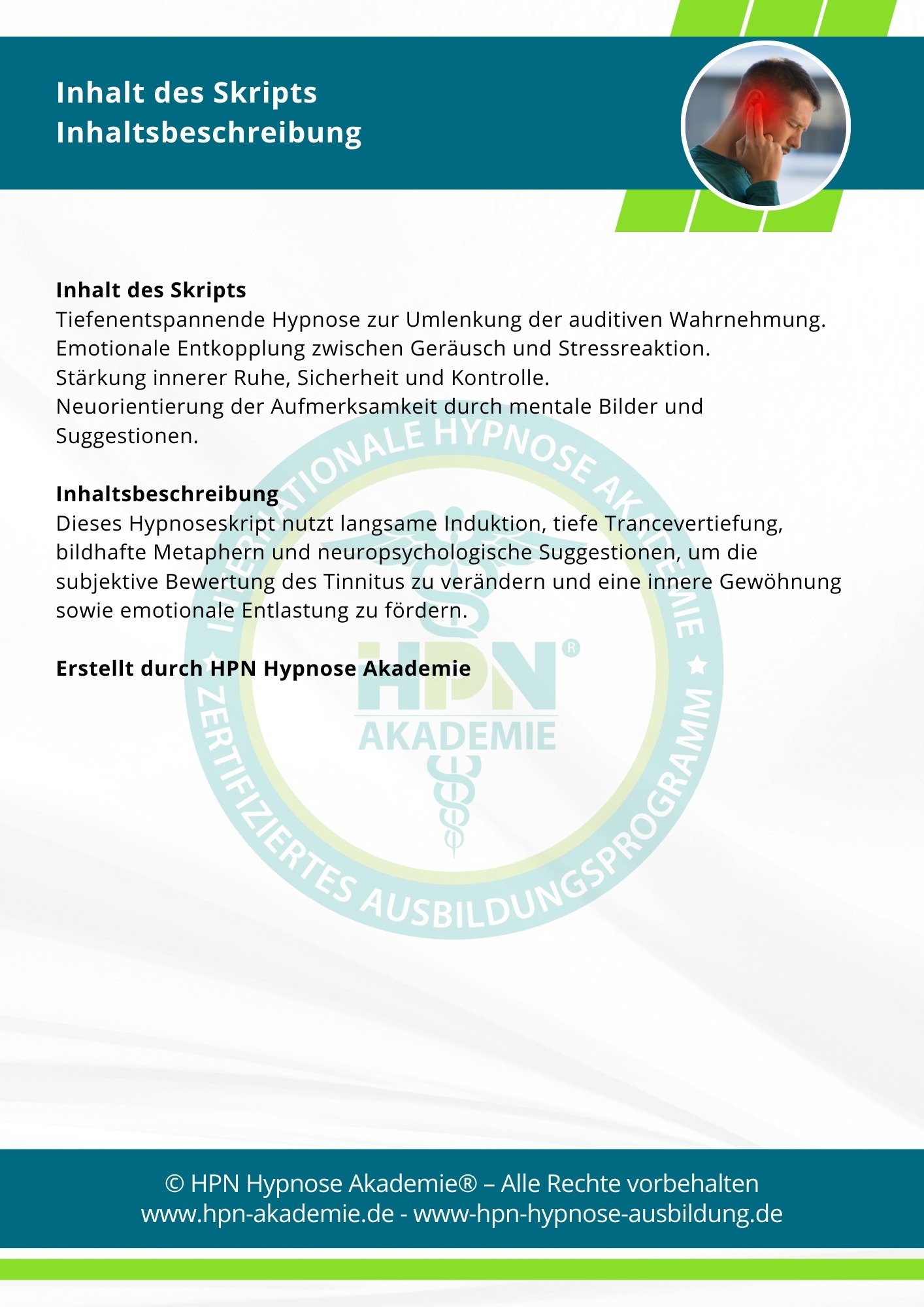 Dieses Hypnoseskript ist geeignet für Menschen, die unter subjektiv wahrgenommenem Tinnitus leiden und lernen möchten, ihre innere Wahrnehmung neu zu regulieren, Stressreaktionen zu reduzieren und eine entspanntere Beziehung zu den Ohrgeräuschen zu entwickeln.