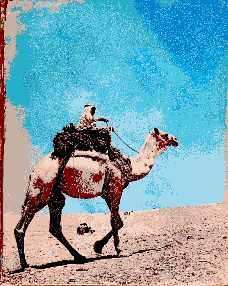 This digital artwork captures a serene moment between a camel and her rider, traversing a textured desert landscape. Enhanced with a variety of filters and color combinations, the image features unique effects and a relief-like background, adding depth and a distinctive artistic touch.