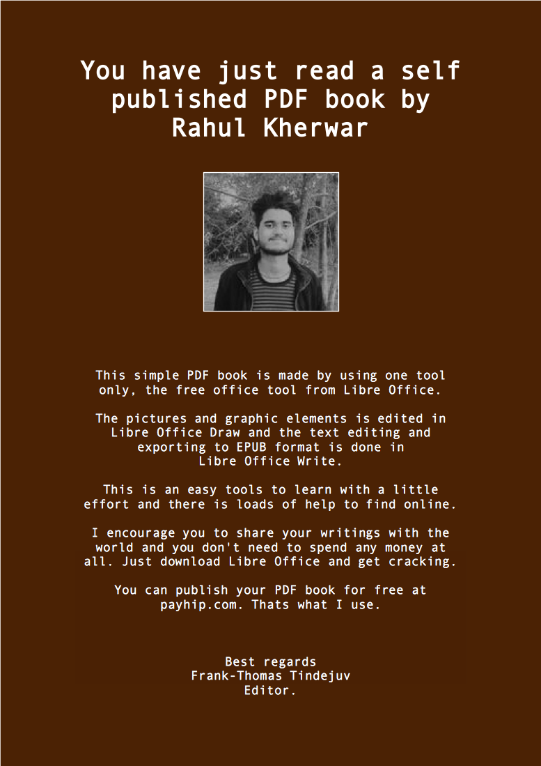 The river of life flows from the cradle to the grave. And in this little book, Rahul offers us small glimpses from his life river. He takes us through both calm bends and dark ravines in his self-publishing debut. 7 reflections and poems about life, emotions, gains and losses. All ingredients in this young man's life.