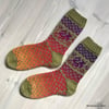 Method: These stranded colorwork socks are knit in the round from the cuff down with a round heel and gusset decreases placed on the sole. The start of the round is placed at the back of the leg and the center of the sole to enable the pattern to flow around your foot as visually uninterrupted as possible. There is an accompanying photo tutorial to aid in correct placement of the heel.