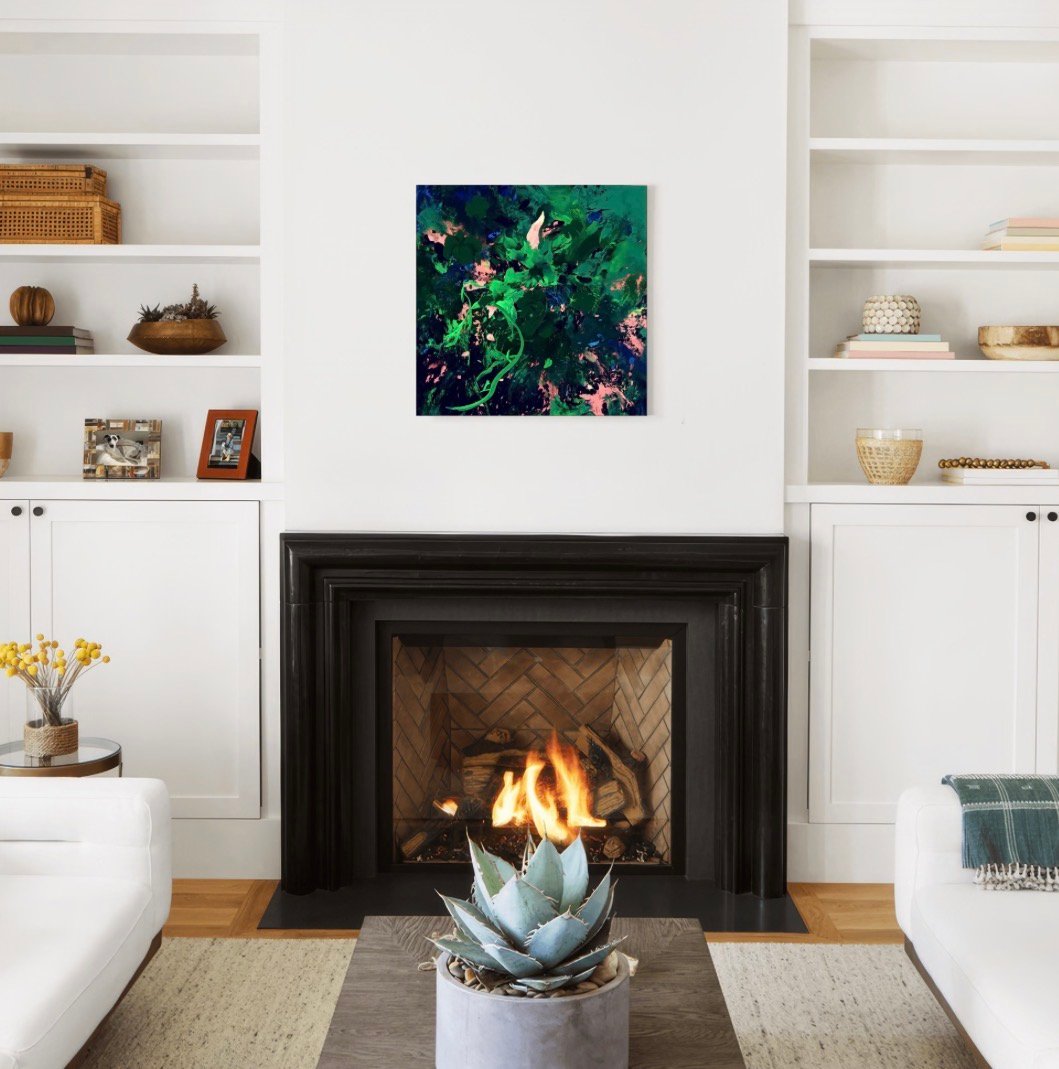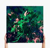 A lush collision of deep emerald and shadowed midnight tones unfolds in a surge of organic movement, pierced by flashes of blush and electric light. Thick, expressive strokes twist and bloom across the canvas like a jungle caught between growth and darkness. The absence of open space intensifies the atmosphere, allowing color and texture to press forward with almost tactile force.
