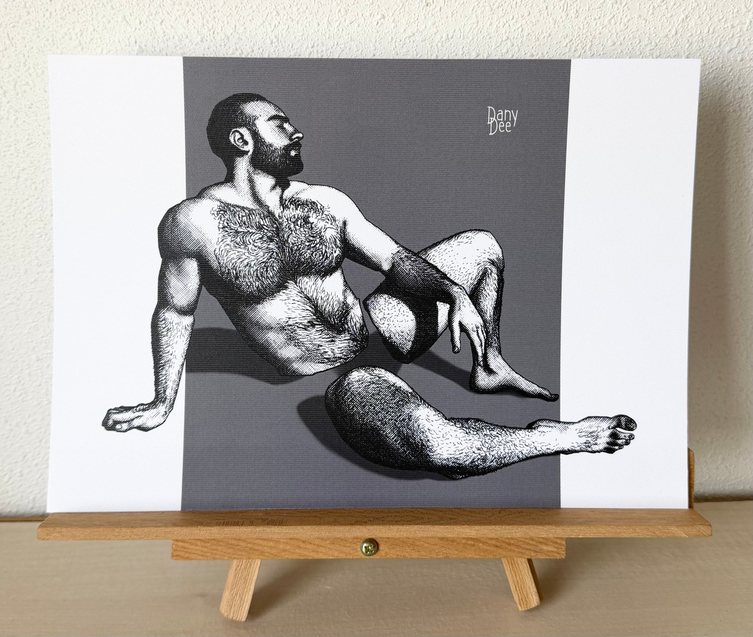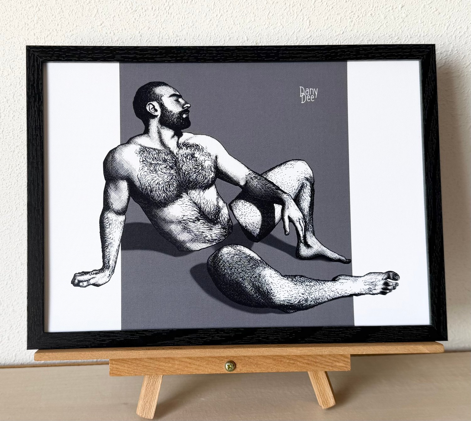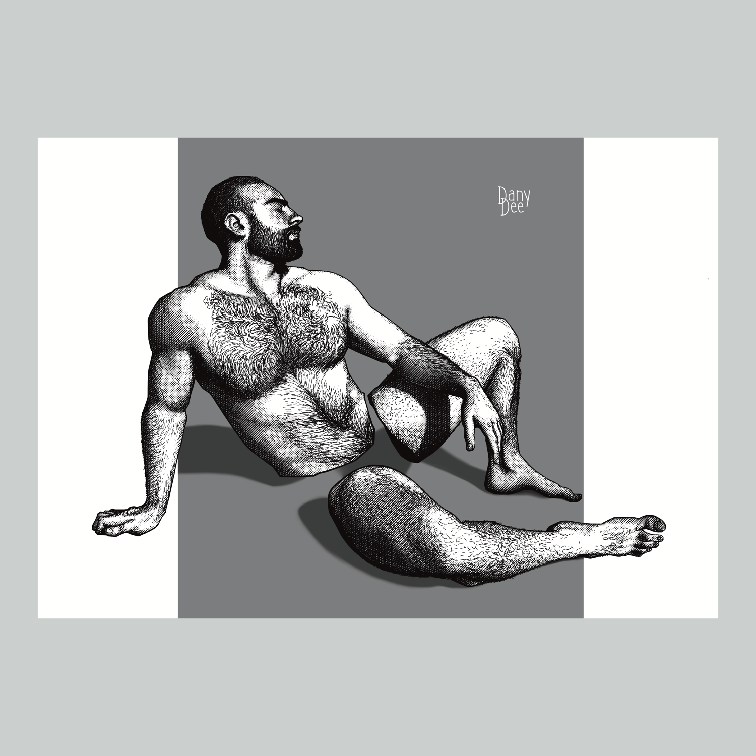 “Hollow No. 1” is a hand-drawn, monochromatic A4 art print from the Hollow series — a conceptual queer art piece exploring censorship through the male nude, where a big, hairy, powerfully built man is rendered in loving detail, but the censored parts are replaced by dark, hollow voids.