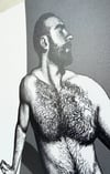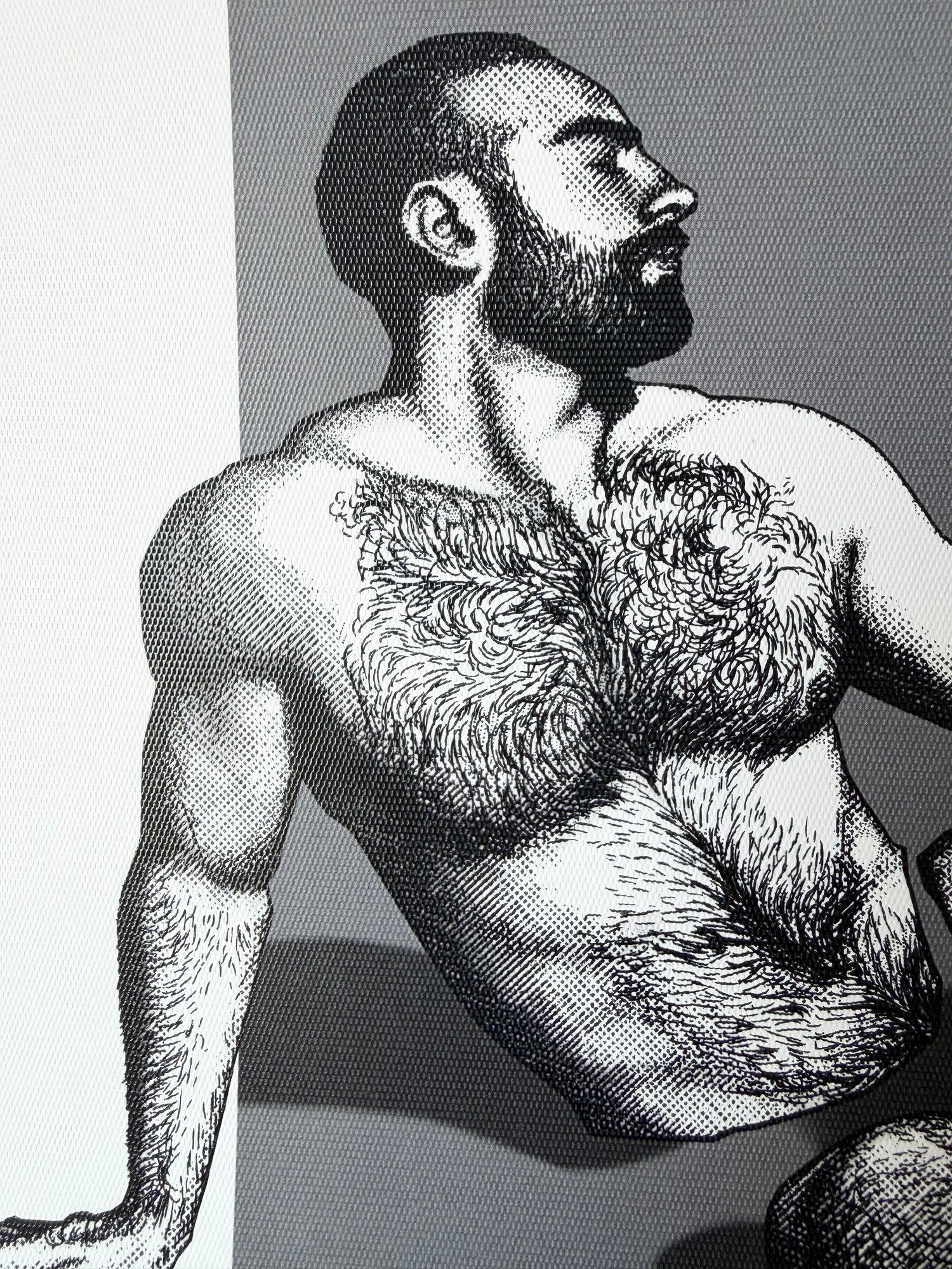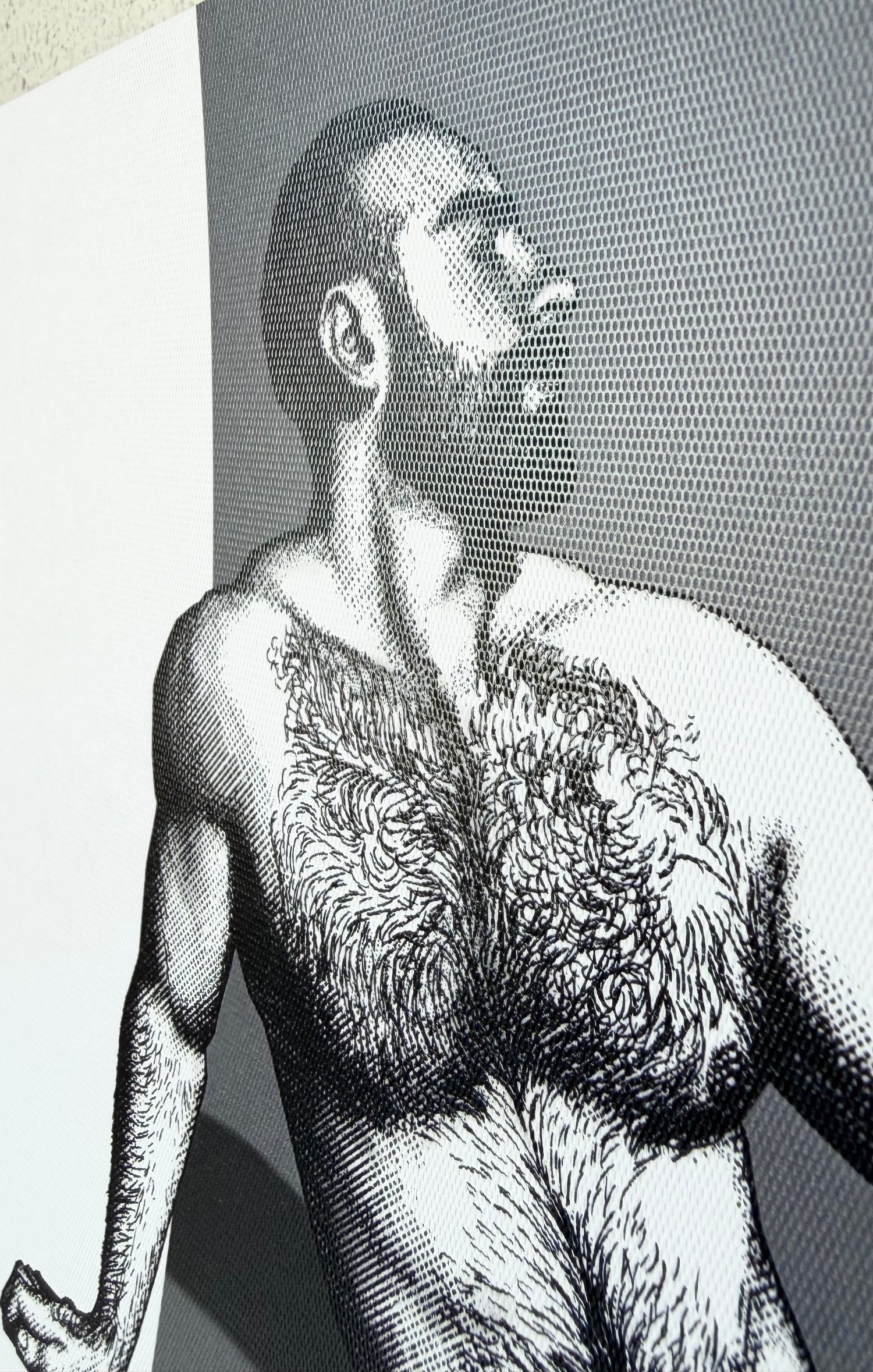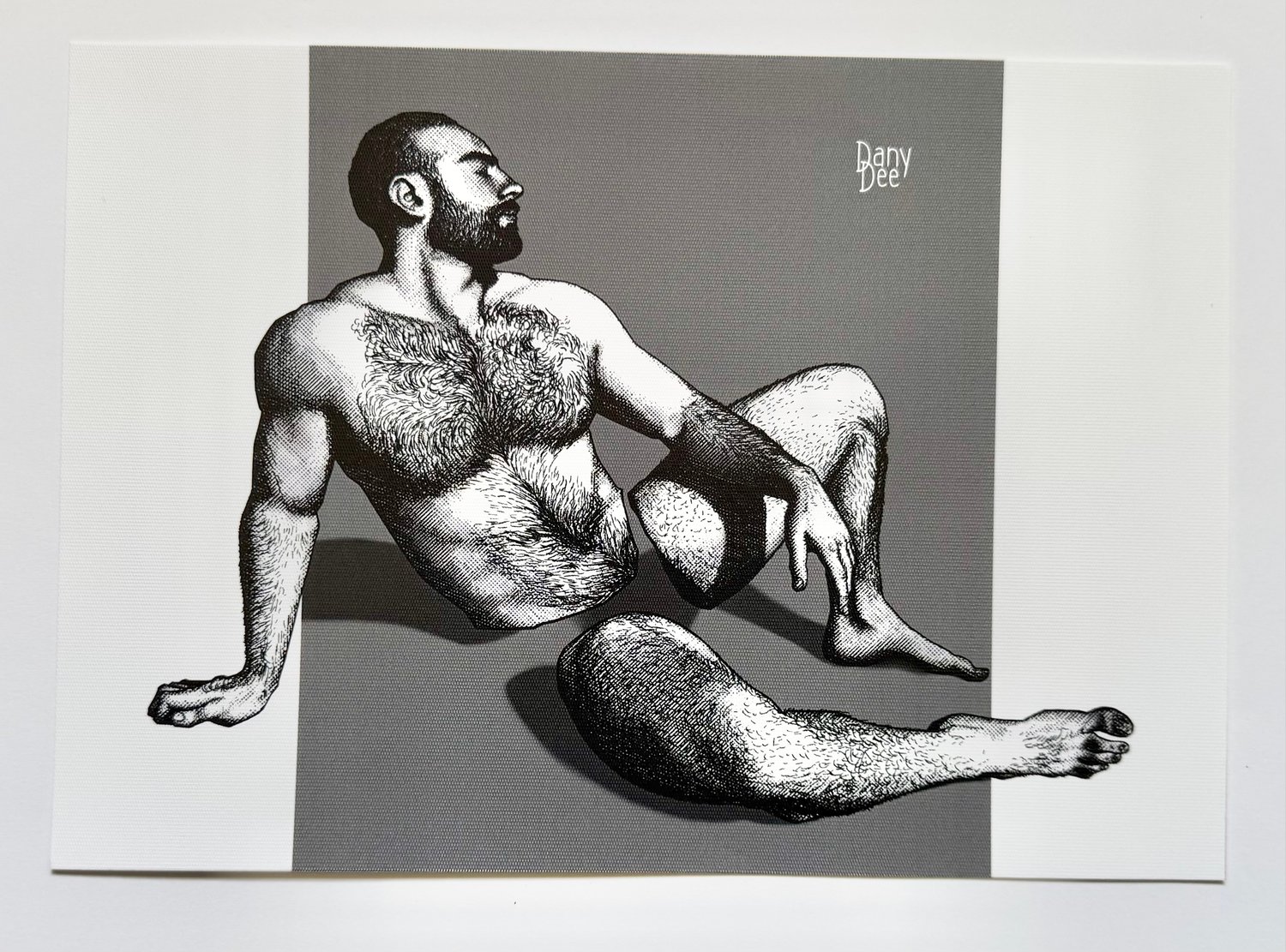 “Hollow No. 1” is a hand-drawn, monochromatic A4 art print from the Hollow series — a conceptual queer art piece exploring censorship through the male nude, where a big, hairy, powerfully built man is rendered in loving detail, but the censored parts are replaced by dark, hollow voids.