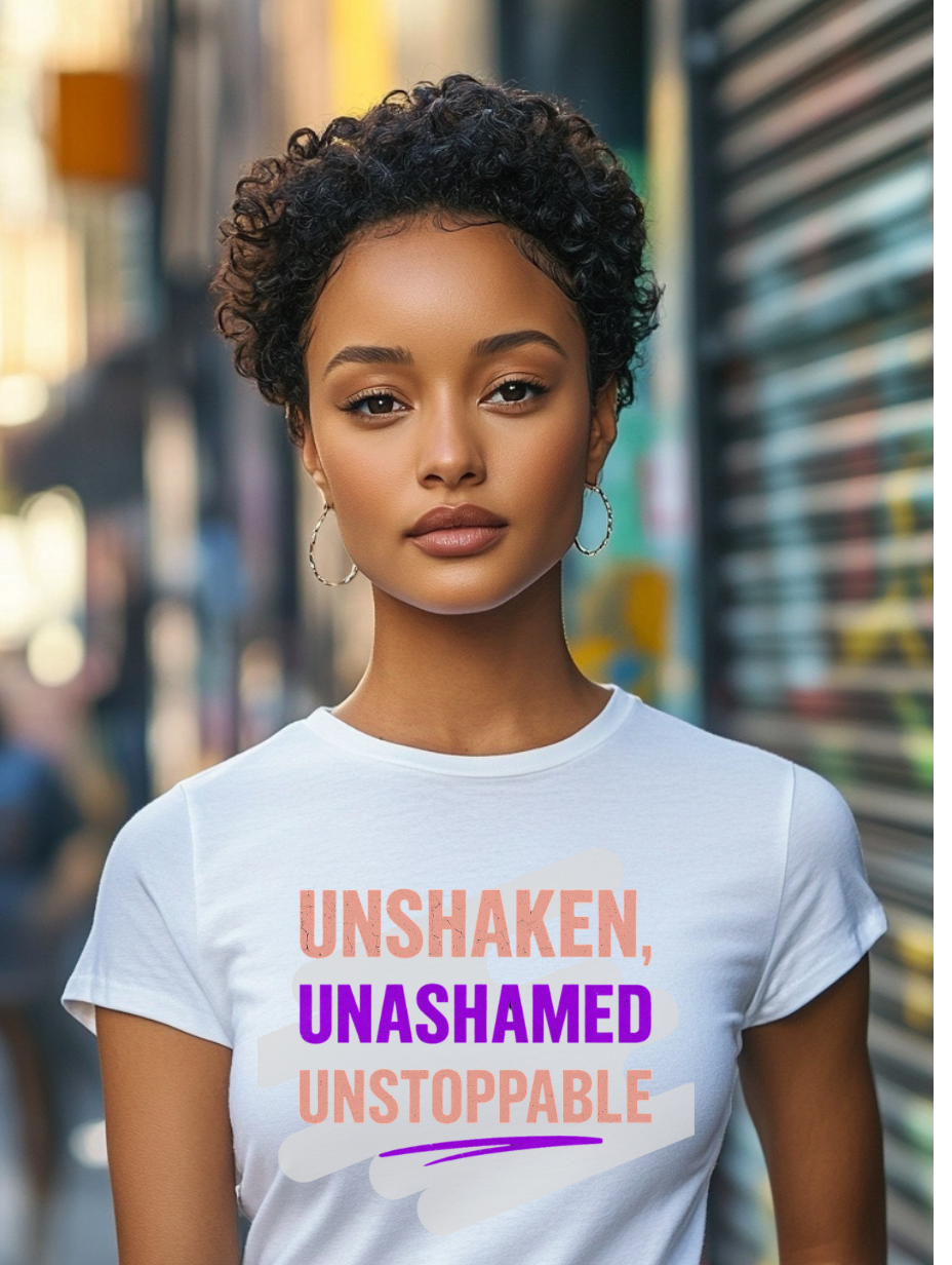 Make a statement with this empowering and faith-filled design featuring the words “Unshaken, Unashamed, Unstoppable” in a modern stacked layout with soft brushstroke accents. The bold pink, purple, and beige tones create a dynamic visual that radiates strength, confidence, and purpose. Perfect for Christian apparel, mugs, journals, planners, and wall art!