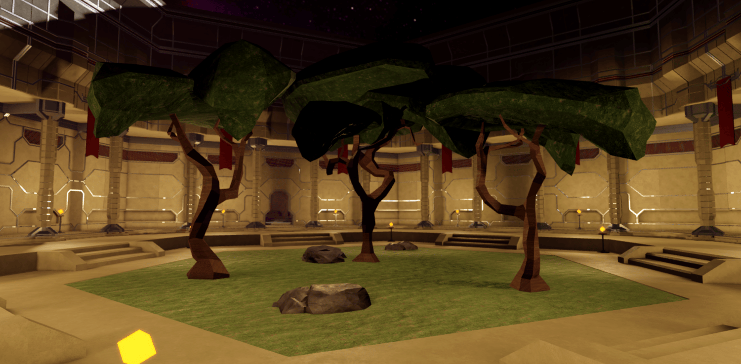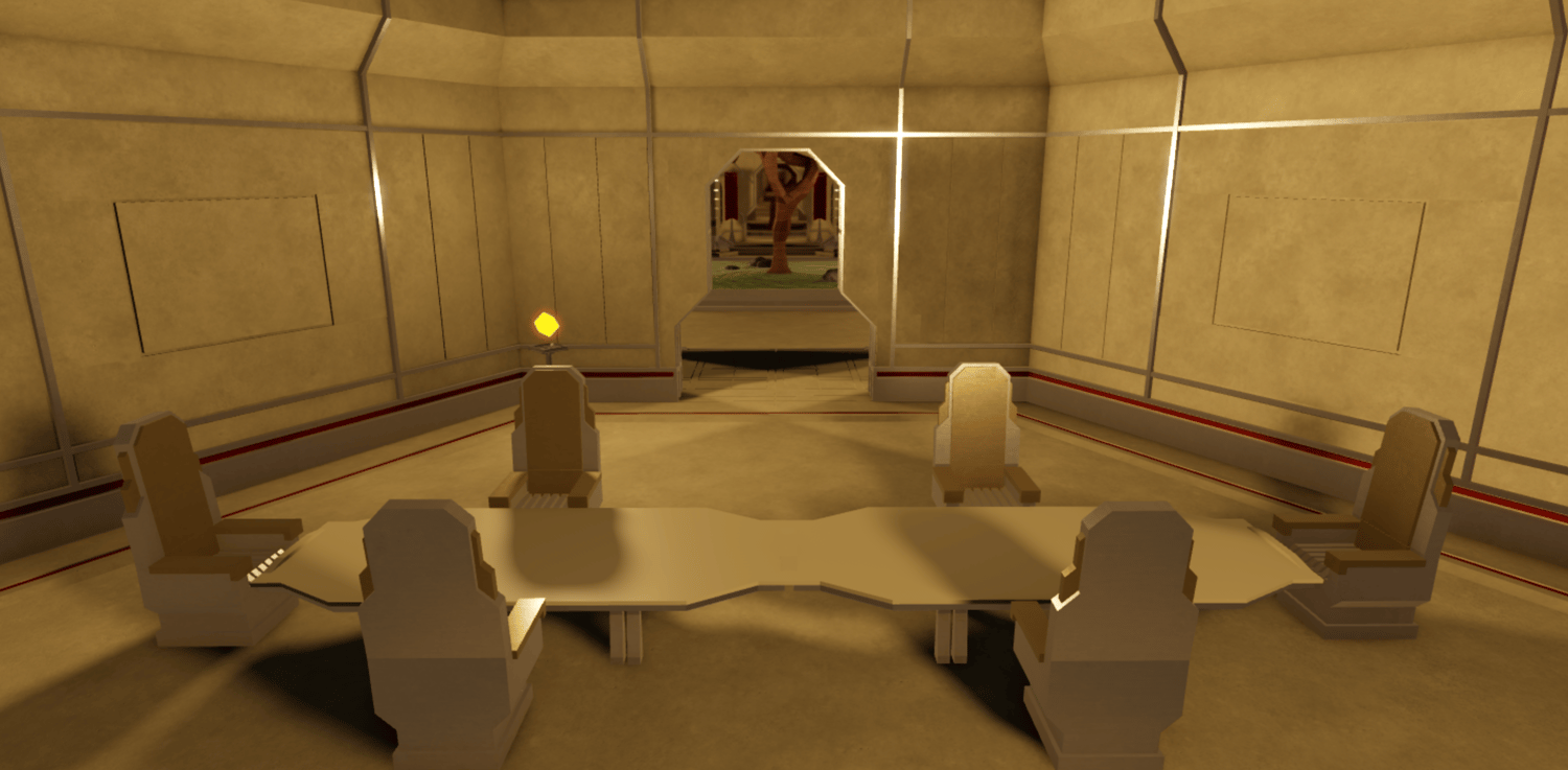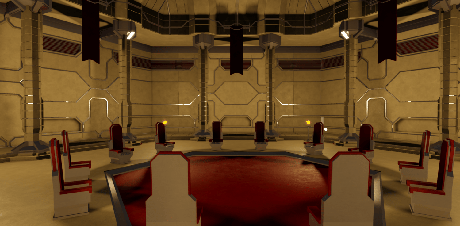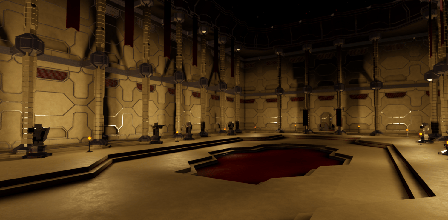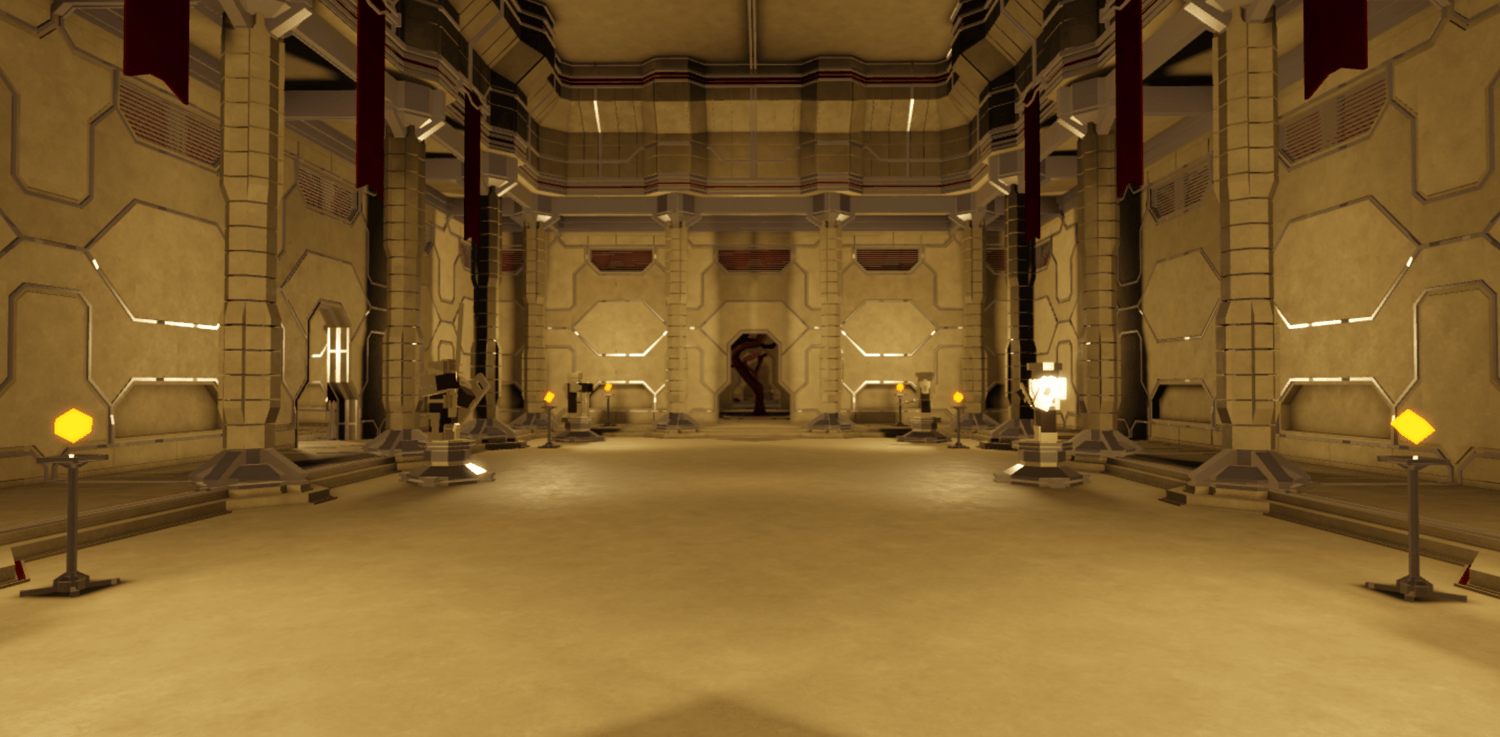 A sleek futuristic palace interior featuring grand corridors, towering geometric walls, and expansive throne rooms with a bold tan and crimson color scheme. Detailed paneled architecture, hexagonal pools, indoor garden atriums with stylized trees, and ambient torch lighting create an elegant yet imposing atmosphere. Spacious halls, meeting chambers, and open gathering areas provide versatile spaces for royal encounters or strategic confrontations. The layout supports smooth navigation across interconnected rooms and dramatic setpieces. Perfect for sci-fi RPGs, space empire games, villain lairs, royal headquarters, roleplay worlds, or cinematic showcases.