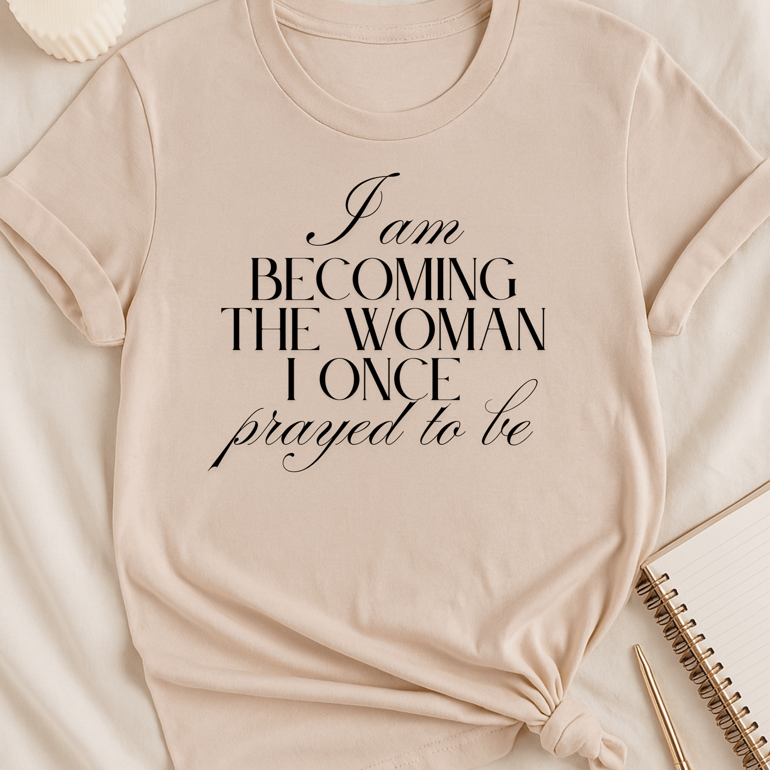 The Becoming Her Affirmation Tee is a declaration of identity, healing, and divine transformation. Featuring the bold and beautiful words “I am becoming the woman I once prayed to be” in our signature elegant font, this premium cotton tee is made for the woman walking in faith, softness, and strength.