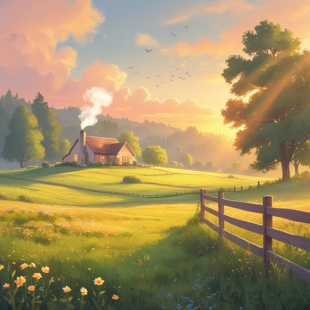 A beautiful good morning country scene — a peaceful countryside at sunrise with soft golden light spreading over green rolling hills, wildflowers, and a wooden fence. A cozy farmhouse with smoke gently rising from the chimney sits in the distance, surrounded by tall trees and a calm meadow. Birds fly across a pastel sky painted in hues of orange, pink, and light blue. The atmosphere feels warm, calm, and full of blessings — a perfect start to the day.