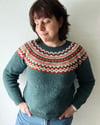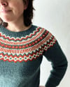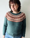 Marnie is worked in one piece, top down, without seams. The yoke features an easy fair isle pattern, while the rest of the sweater is worked in stocking stitch.