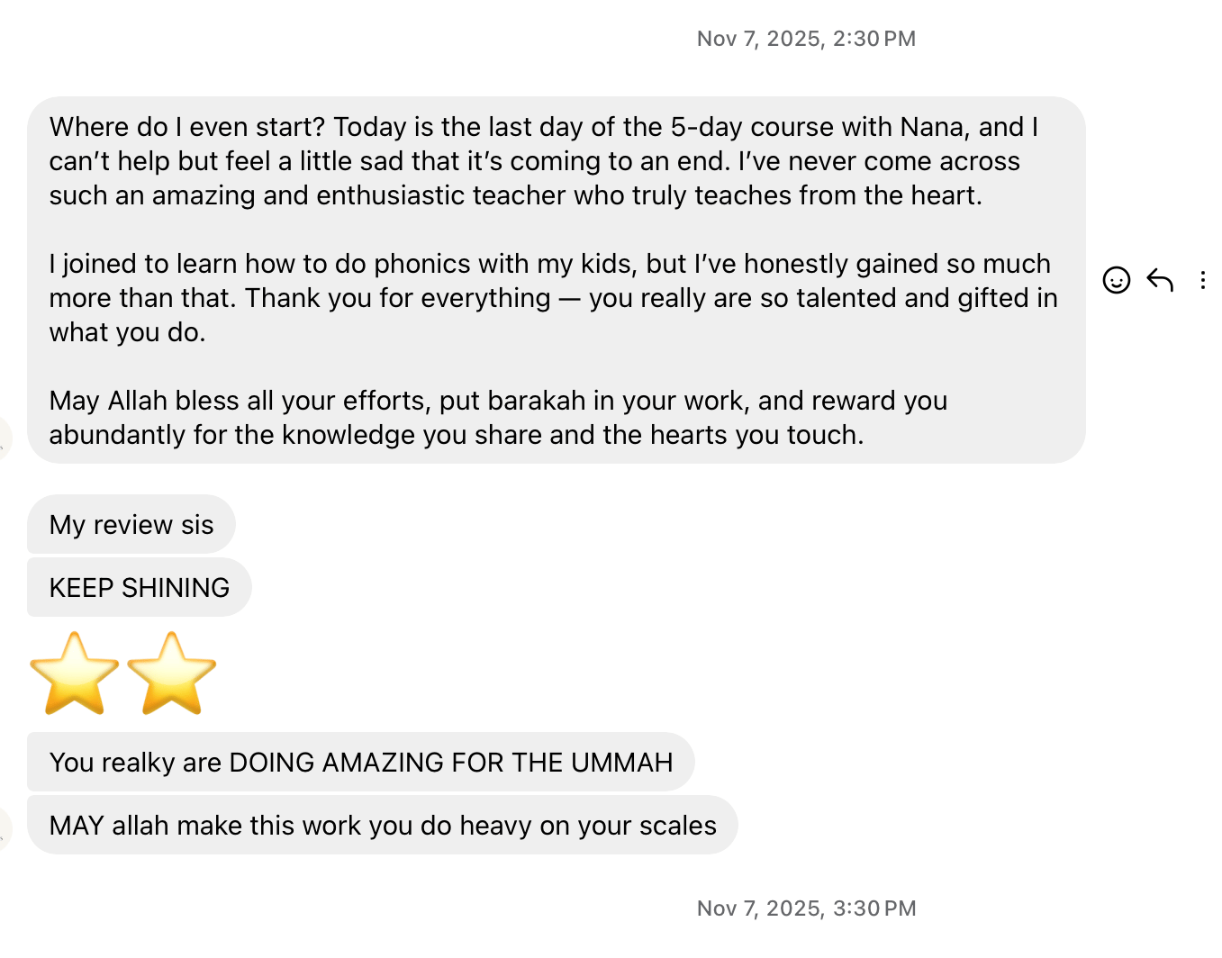 ''I just wanted to share a win Alhamdulillah. First I’d like to say may Allah reward you for helping me teach my son blending and reading. We’ve been working on word families and over time with practice, he is becoming more familiar with the words and blending them a lot more fluently Alhamdulillah Allahuma Barik lahu!''