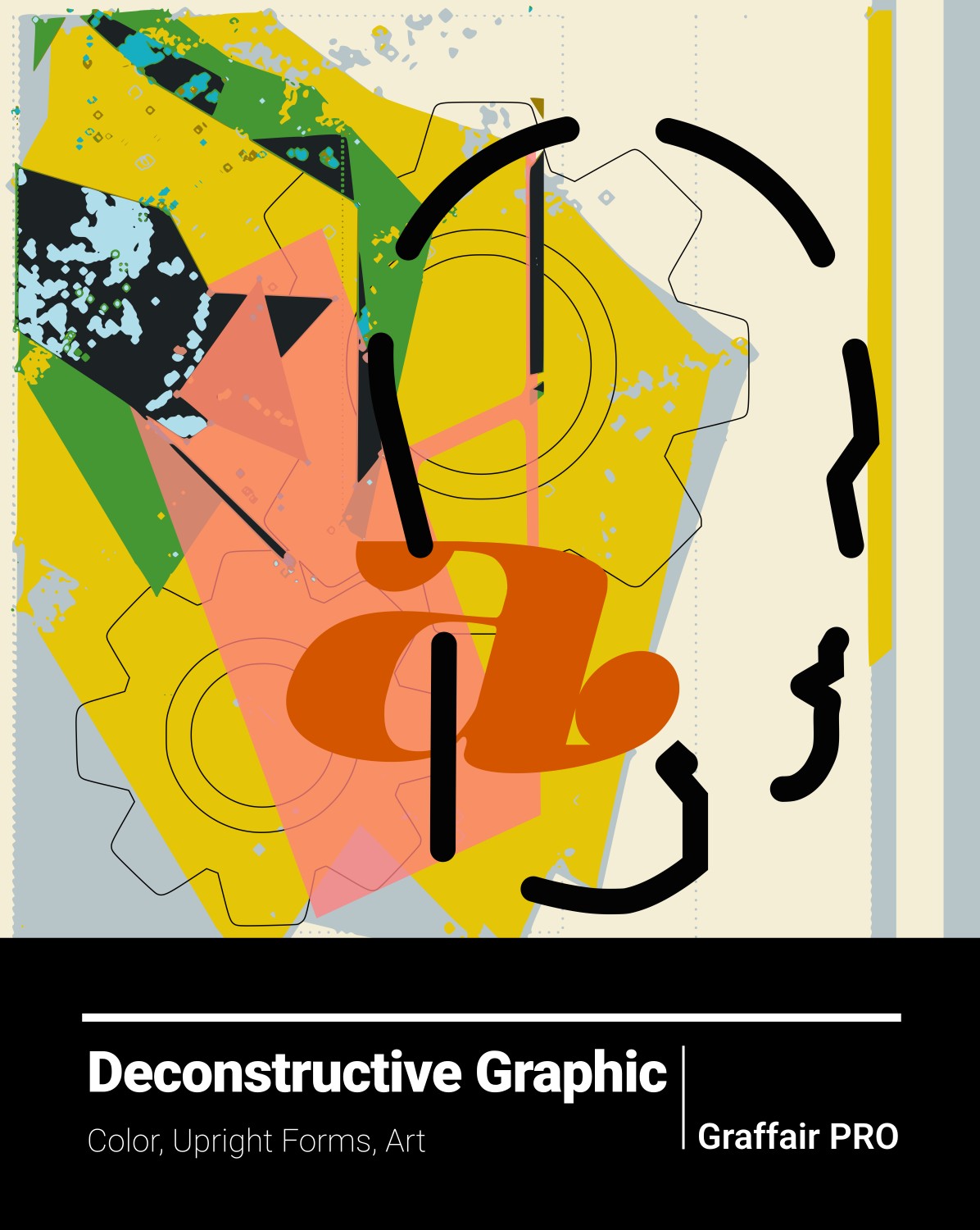Deconstructive Graphic: An abstract composition of upright forms, type, and illustrations. A graphic art piece that speaks the voice of the art itself loudly.