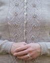 Dies ist eine leichte Strickjacke, welche zwei Panele mit Ajour- und Popcornmuster ziert. Die Strickjacke wird nahtlos von oben nach unten gestrickt und die Ärmel werden nach der Contiguous-Methode geformt. Der Körper wird ohne Ab- oder Zunahmen gestrickt, diese können jedoch einfach hinzugefügt werden.