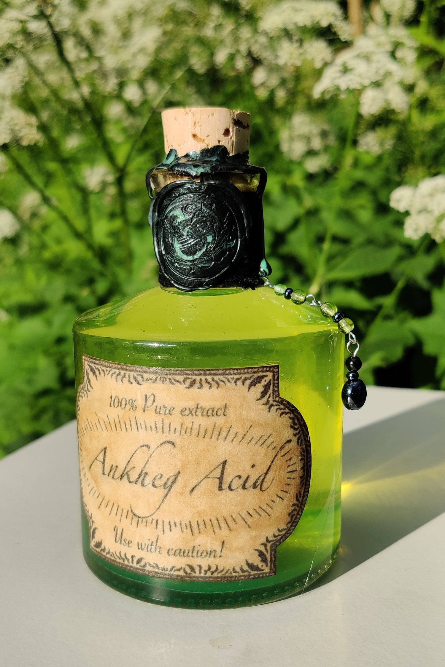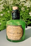 Pullossa on vihertävän keltaista nestettä ja se on koristeltu käsintehdyllä etiketillä, sinetillä, juuttinarulla sekä helmiyksityiskohdalla.