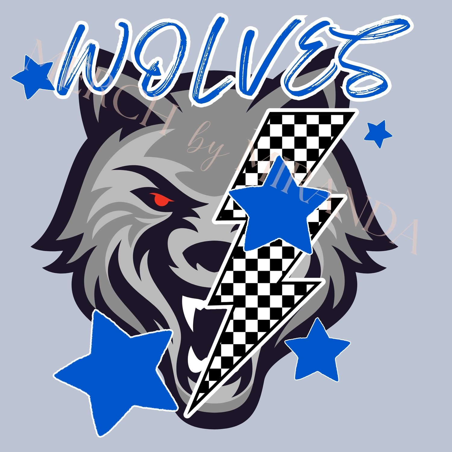Wolf Mascot Blue | Sublimation Design | Digital Download | School Spirit Shirt PNG | DTF Design | Lightning Bolt-Checkered with Stars - Wolves