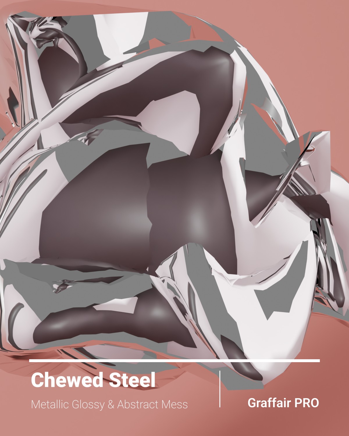 Chewed Steel: A 3D illustration of an abstract glossy sculpture showcasing a dynamic mess of a reflecting metallic chewed object.