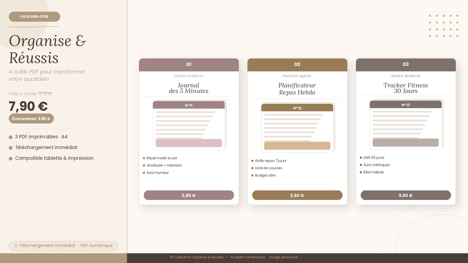 ✦ Journal des 5 Minutes — Commence et termine chaque journée avec intention. Gratitude, objectifs, bilan : un rituel court qui change tout.