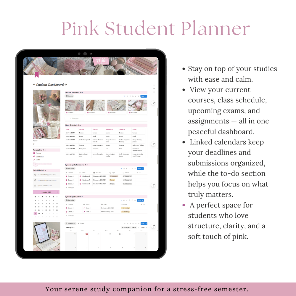 Stay organized, focused, and motivated with the Student Planner Template! Designed for students of all levels, this template helps you manage courses, schedules, assignments, exams, and quick links all in one place. With an aesthetic layout and intuitive structure, it’s perfect for tracking your daily tasks, upcoming submissions, and study goals. Whether you want to plan your week, keep notes, or track progress, this template makes studying efficient, stress-free, and visually enjoyable.