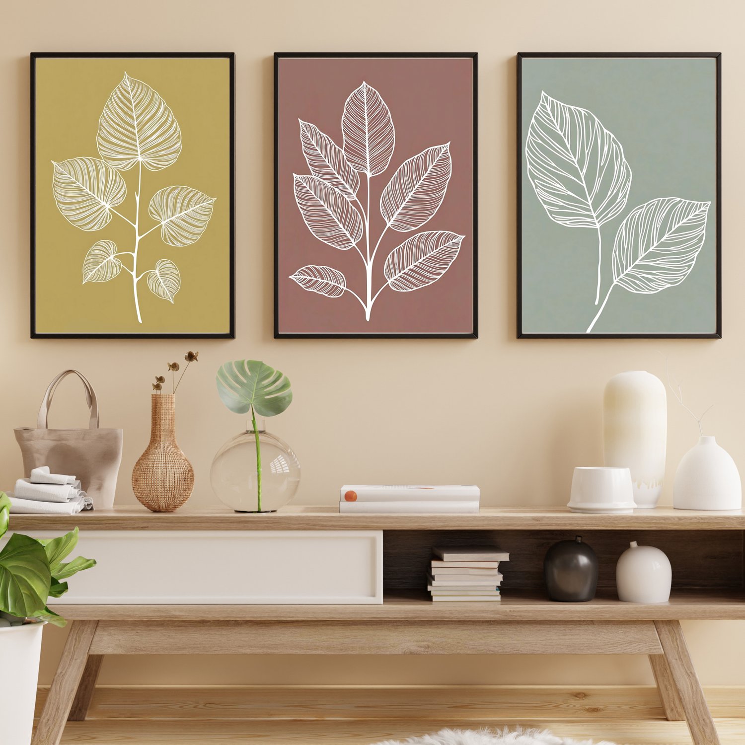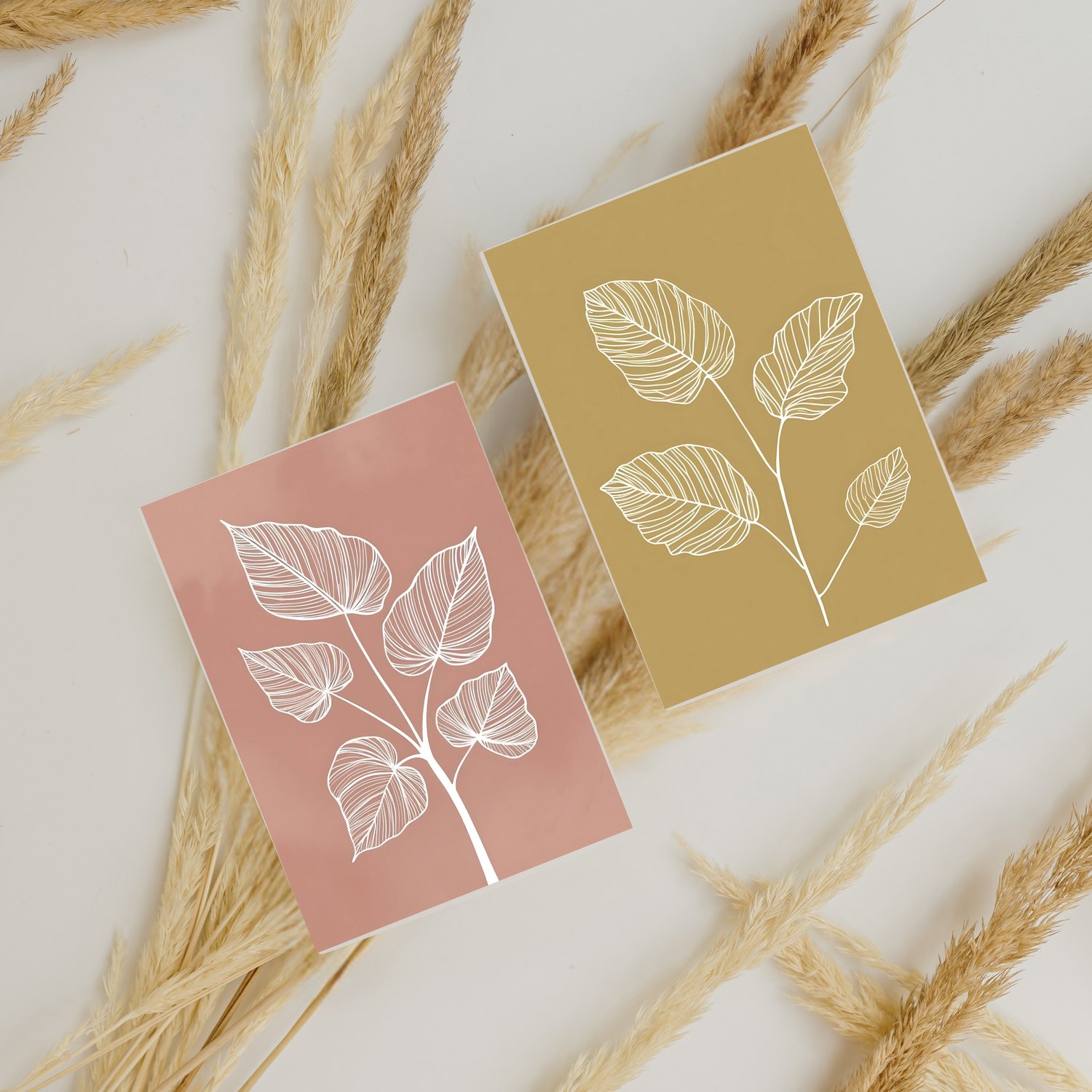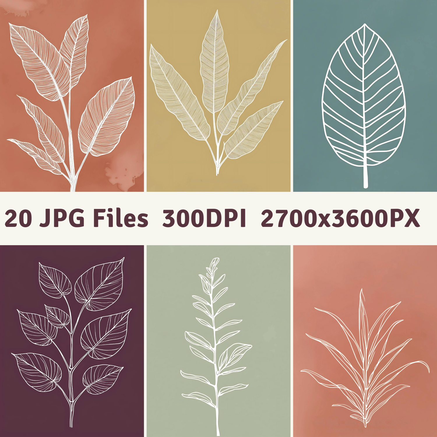 Bring timeless elegance and organic charm into your creative projects with this collection of minimalist botanical line art. Each design features a delicate white one-line illustration of popular plant species — like monstera, eucalyptus, banana leaves, ferns, and more — set against beautifully curated earthy backgrounds in soft terracotta, sage green, mustard yellow, dusty rose, and other warm, muted tones.