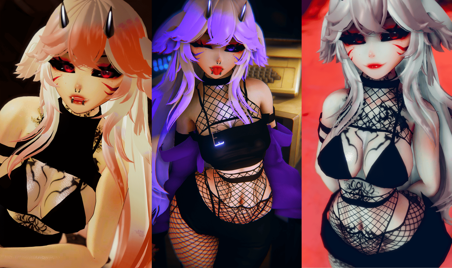 breast slider, butt slider, face shape slider, skin tone, tattoos, black sclera, face marks, body glitter, left horn, right horn, ears, tail, long hair, extra hair strands, piercings