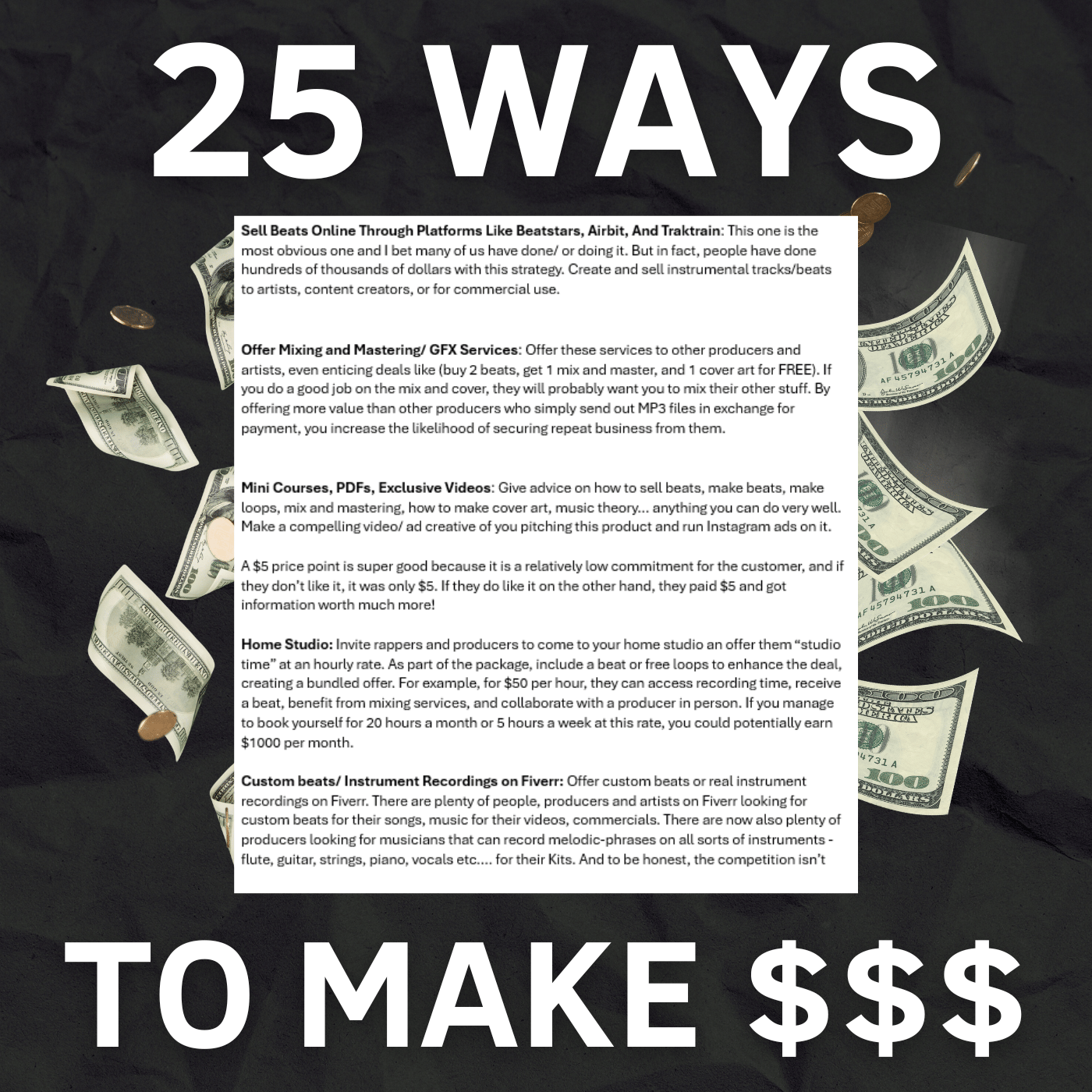 This FREE PDF gives you 25 ways to make money as a music producer. Whether you're just starting out or you've been in the industry for years. This guide equips you with actionable strategies to skyrocket your earnings as a music producer.