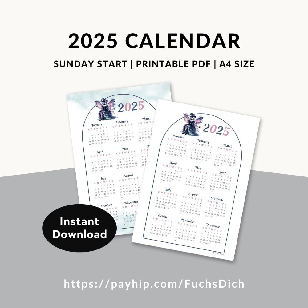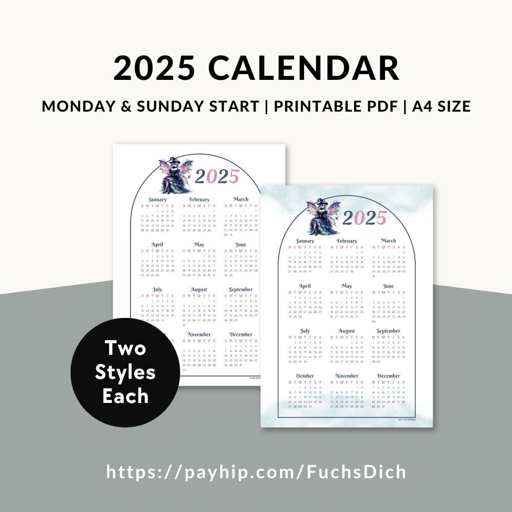 Stay organized in year 2025 with our cute printable yearly calendar! There are 2 styles for each Monday and Sunday starts. This A4 size year 2025 calendar is perfect for any workspace. Choose between Monday or Sunday start versions to suit your planning style. Whether you print it or use it digitally, this calendar will help you stay on top of your schedule and goals throughout the year of 2025.