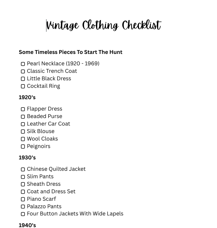 Into thrifting? Let this "Vintage Clothing Checklist' guide the way to incorporating timeless classics into your current wardrobe. Mixing the old with the new to display your style authenticity through these wardrobe staples from yesteryear. Vintage pieces are often much higher quality in fabrics and craftmanship. If you own a thrift store, this printable checklist is a great hand out for your clientele. A scavenger hunt of sorts.