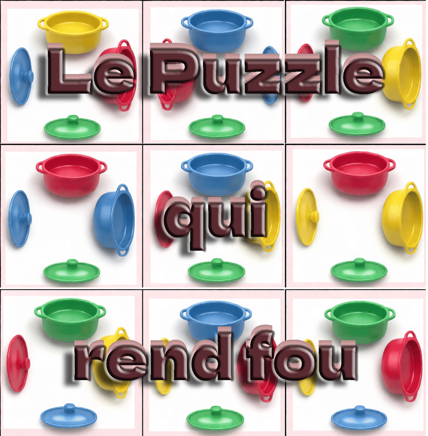 Tu imprimes et découpes les 9 pièces du puzzle. Puis tu essaies de les assembler de facon à faire coincider marmites et couvercles selon leurs couleurs. Il y a 2 solutions. On ne peut pas faire plus facile.