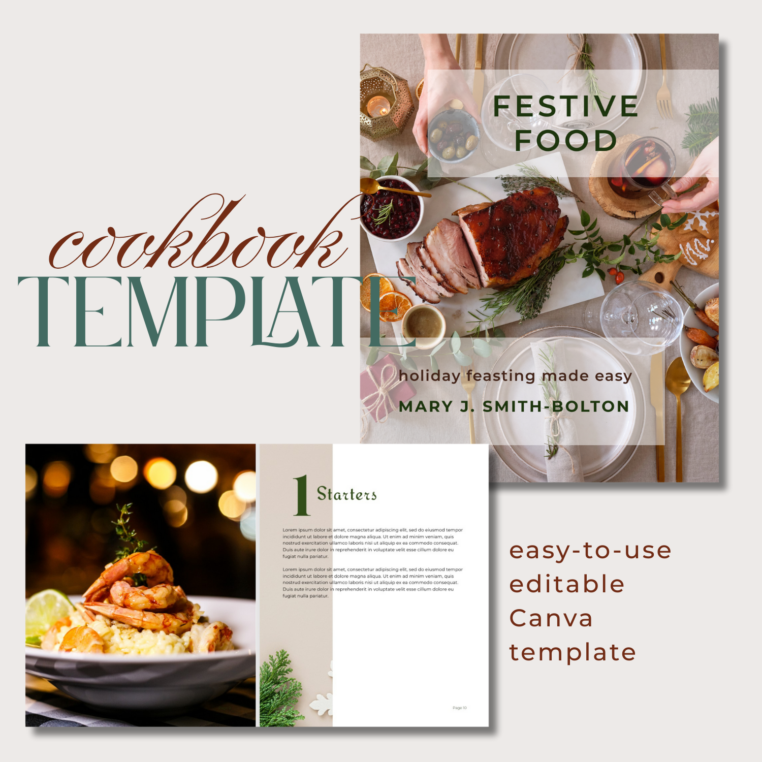 Designed for Canva free accounts - with free elements - and no extra cost for you. Sized to cookbook standard 8 x 10 in. Available in 4 unique designs: minimalist, classic, festive or colorful party. Just add your own photos, recipes and text. Flexible format that expands to the number of recipes you want to include.