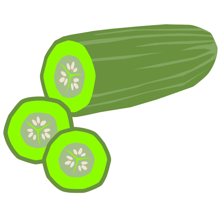 This vibrant illustration features a whole cucumber alongside several refreshing slices. The light green flesh with visible seeds contrasts beautifully with the darker green outer skin, highlighting the crisp, hydrating nature of cucumbers. Known for their cooling properties, cucumbers are a perfect addition to salads, snacks, or detox waters. This simple yet appealing design showcases the fresh and nutritious qualities of this beloved vegetable.