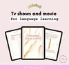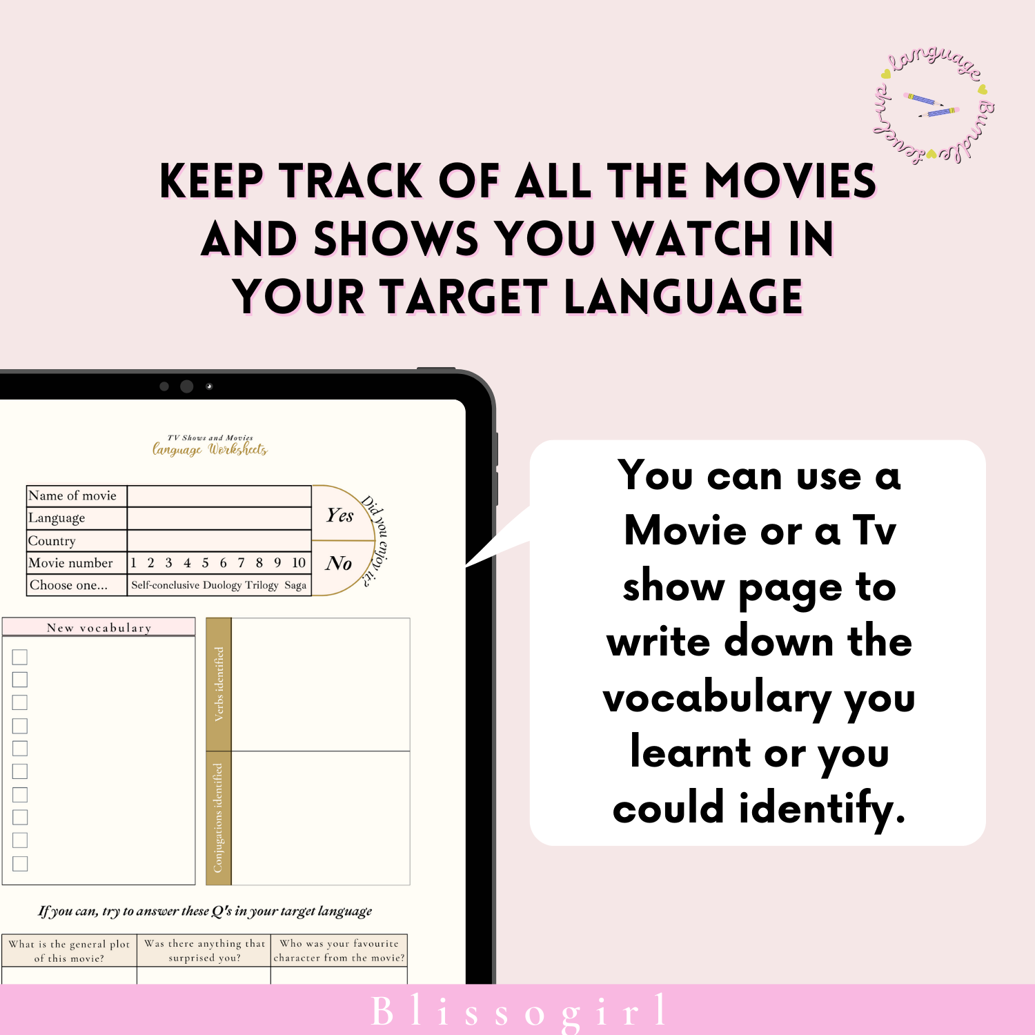 📑💻 Tv shows and movies workbook: This workbook will help you keep track of the movies and tv shows you're watching in your target language, and you'll be able to complete all the details about it in said language. You can also use it to register the new words you learn while watching.