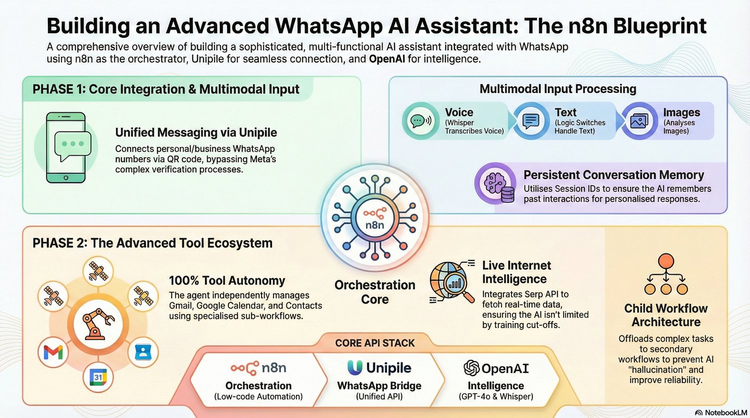 Building an Advanced WhatsApp AI Assistant is a comprehensive, step-by-step blueprint for creating a powerful, production-ready WhatsApp AI assistant using n8n for orchestration, Unipile for WhatsApp integration, and OpenAI for intelligence.