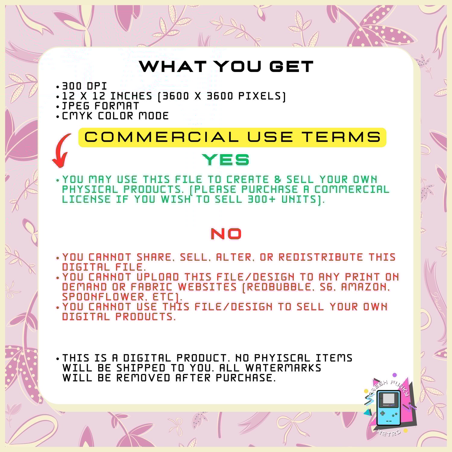 - You cannot upload this file/design to any print on demand or fabric websites (Redbubble, S6, Amazon, Spoonflower, etc).