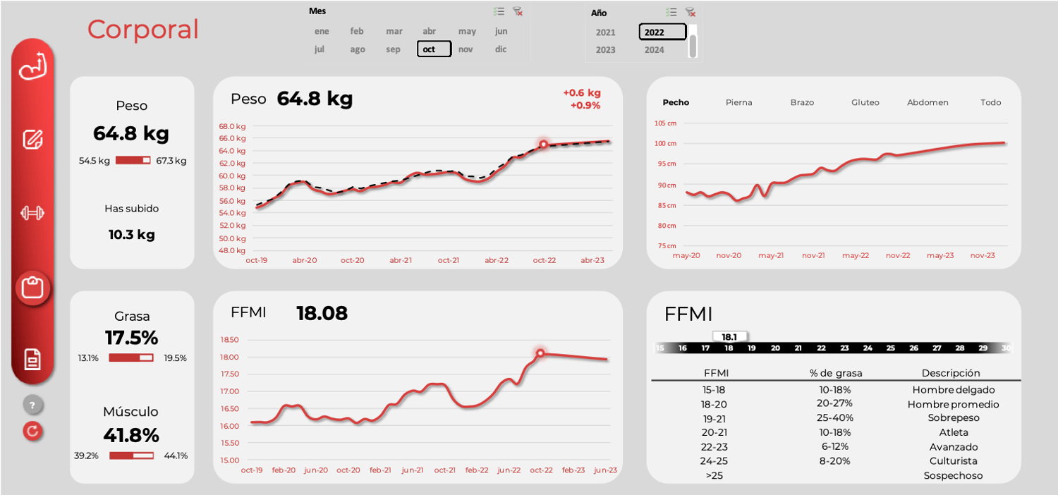 - Seguimiento Corporal: Monitorea tu peso, medidas corporales y porcentaje de grasa y músculo.