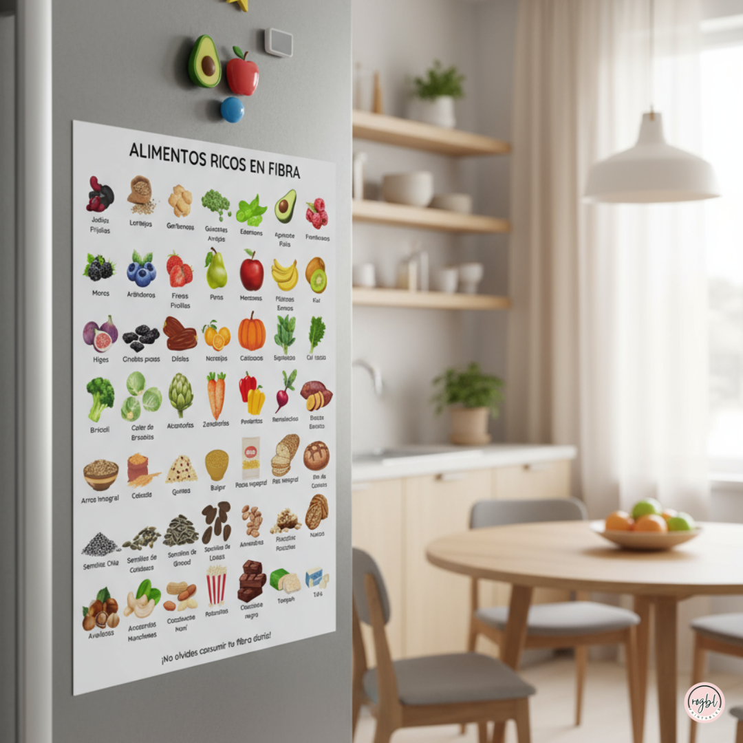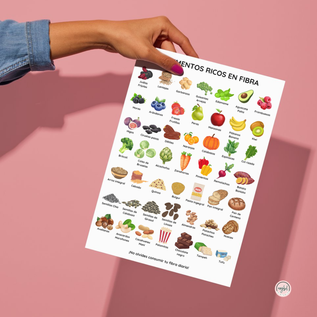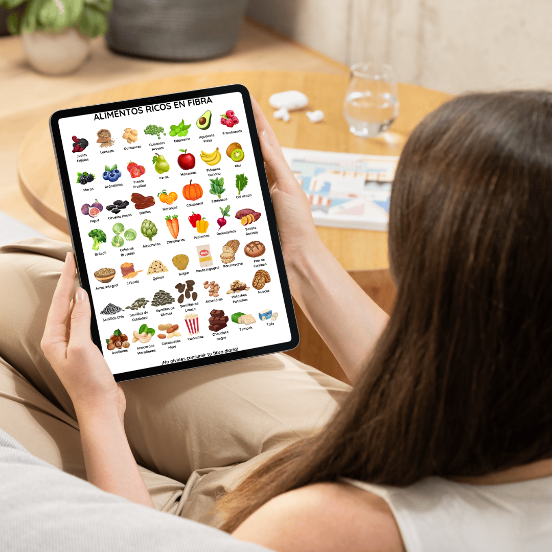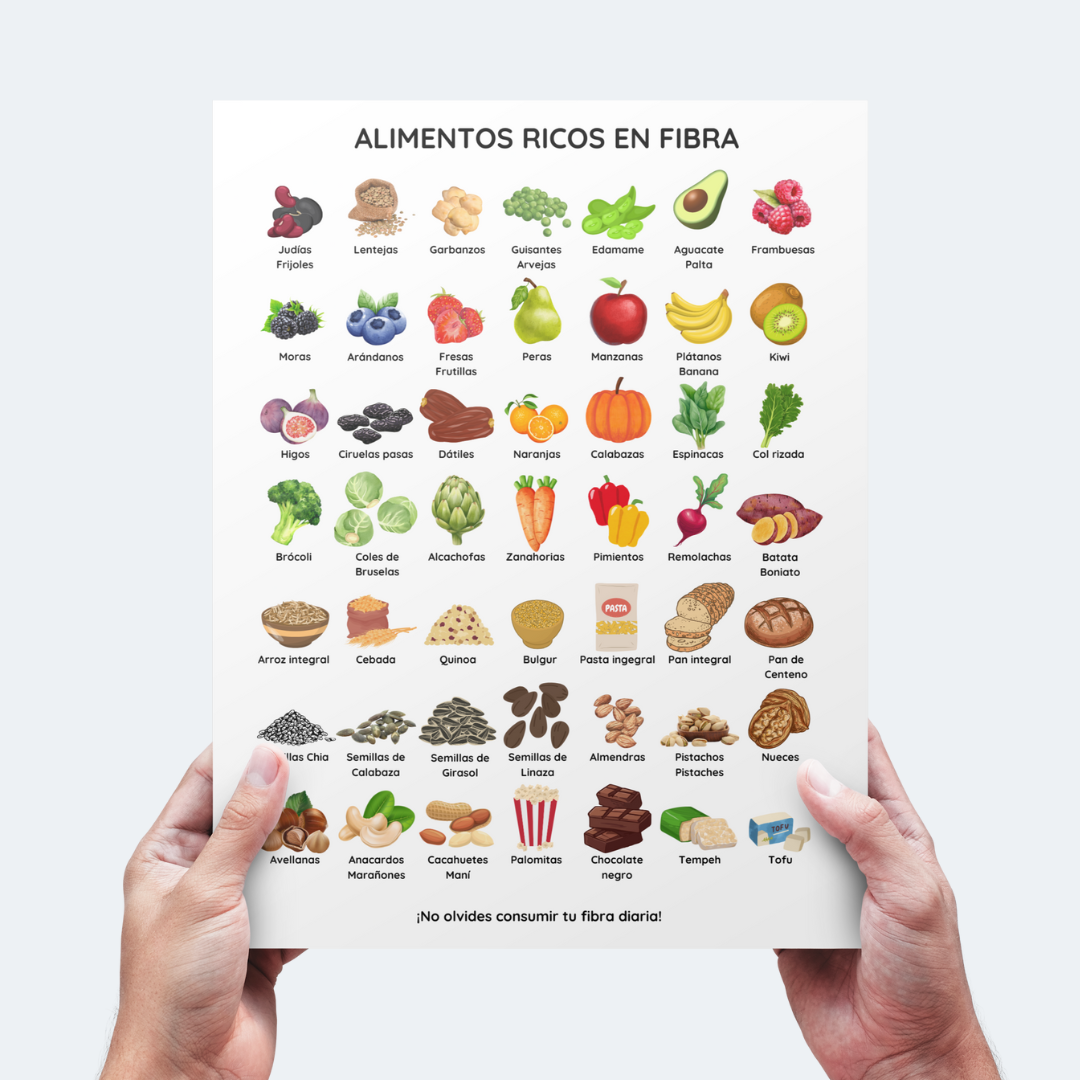 Incluye una lista completa de alimentos con alto contenido de fibra, perfecta para llevar una alimentación más consciente.