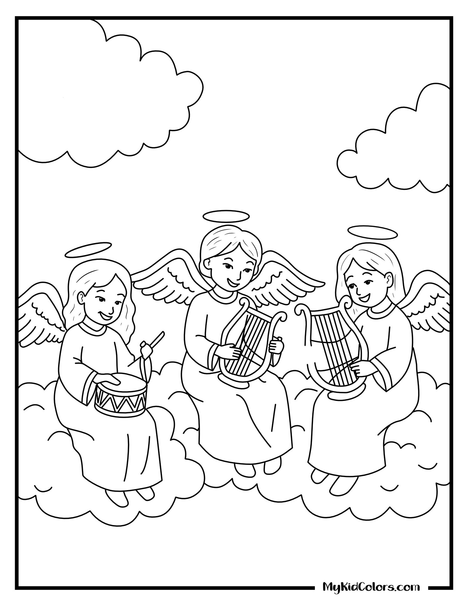 - Various scenes, such as angels singing, playing instruments (like a drum and harp), playing a trumpet with the message "Peace on Earth," and interacting with children.