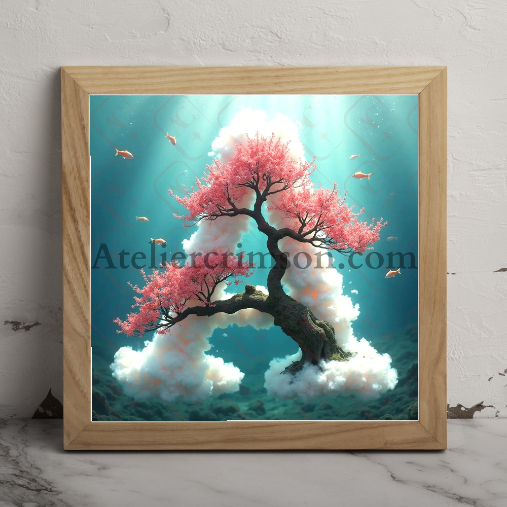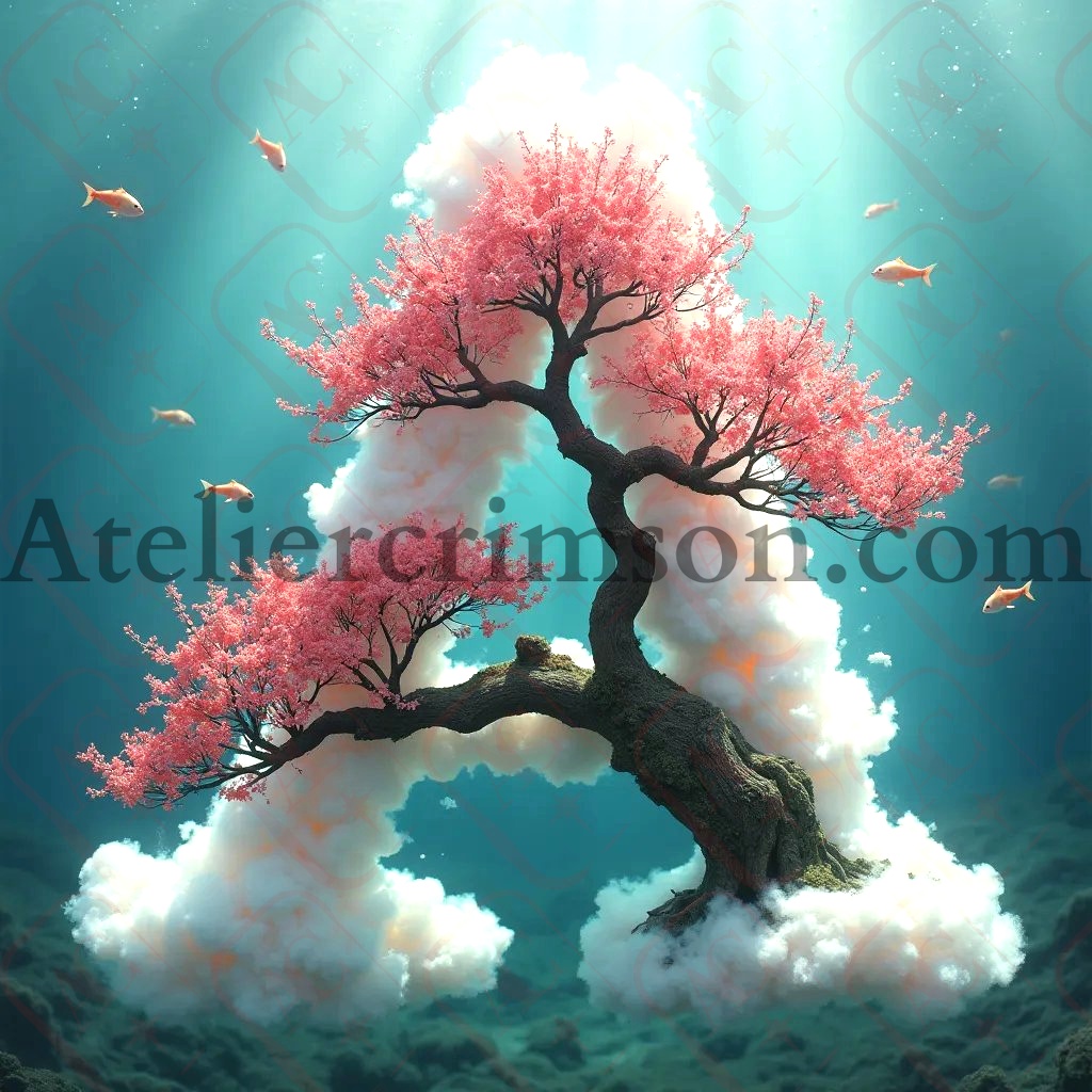 The letter A bonzai aquamarin cloud a captivating digital painting with a serene underwater bonsai. Download Now this high quality AI-generated image, perfect for adding a touch of tranquility and creativity to any space.