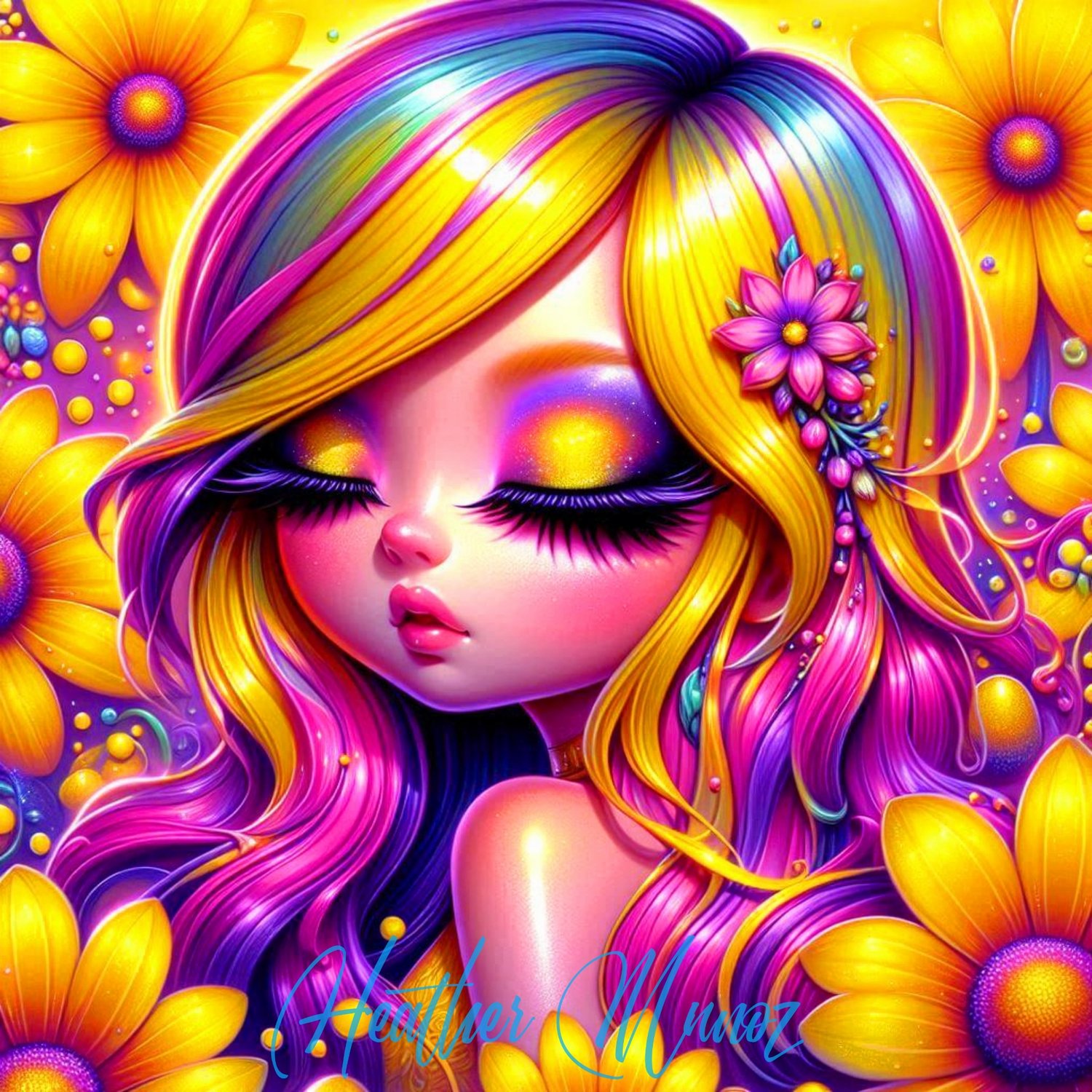 Beautiful chibi girl in a field of flowers with vibrant yellow and fushia