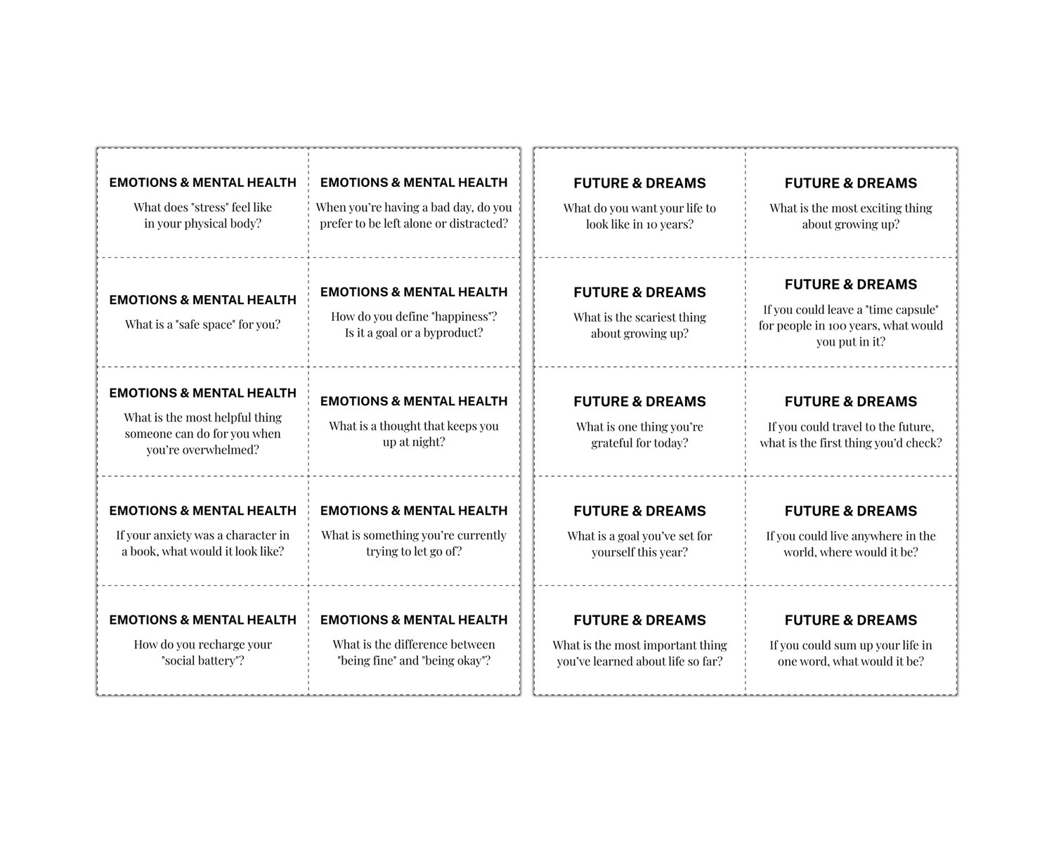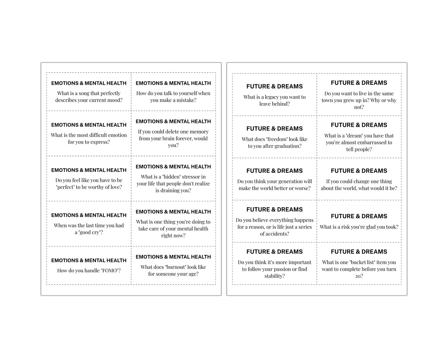 Start meaningful conversations with teens using this set of 120 teen conversation starter cards. They can be used in classrooms, therapy, or counseling sessions. The questions encourage honest and thoughtful conversations. Families can also use the cards to build stronger connections at home. These teen talk cards even work well as a fun conversation game.