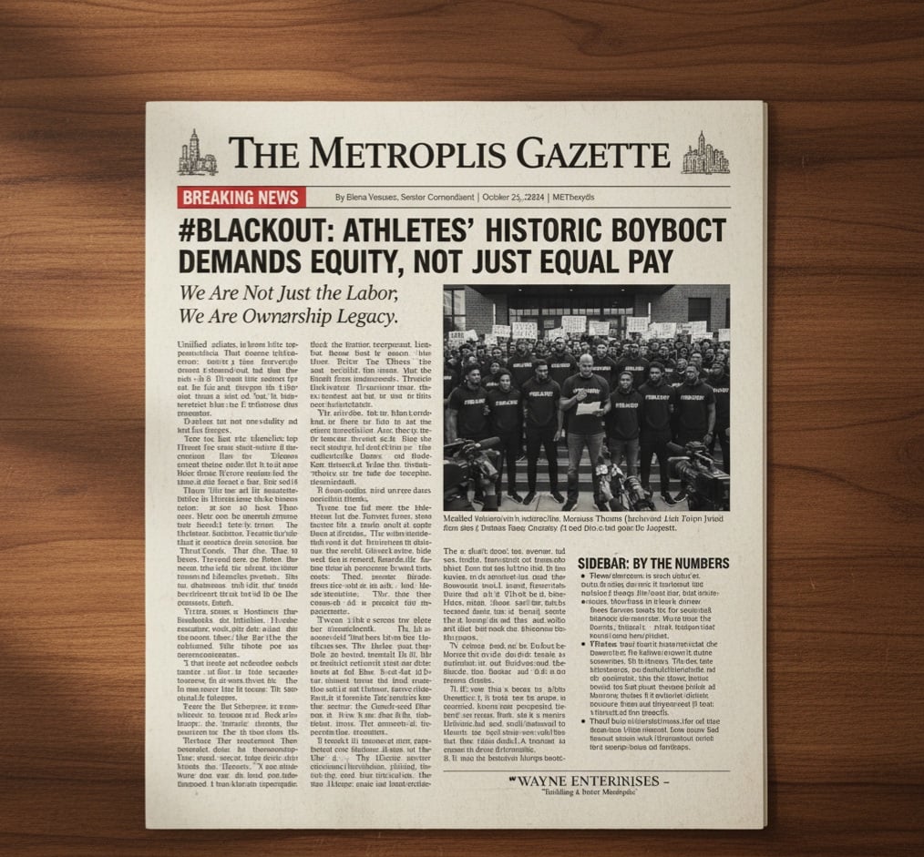 THE METROPOLIS GAZETTE** **BREAKING NEWS** --- # **#BLACKOUT: ATHLETES' HISTORIC BOYCOTT DEMANDS EQUITY, NOT JUST EQUAL PAY** **"We Are Not Just the Labor; We Are the Legacy"**