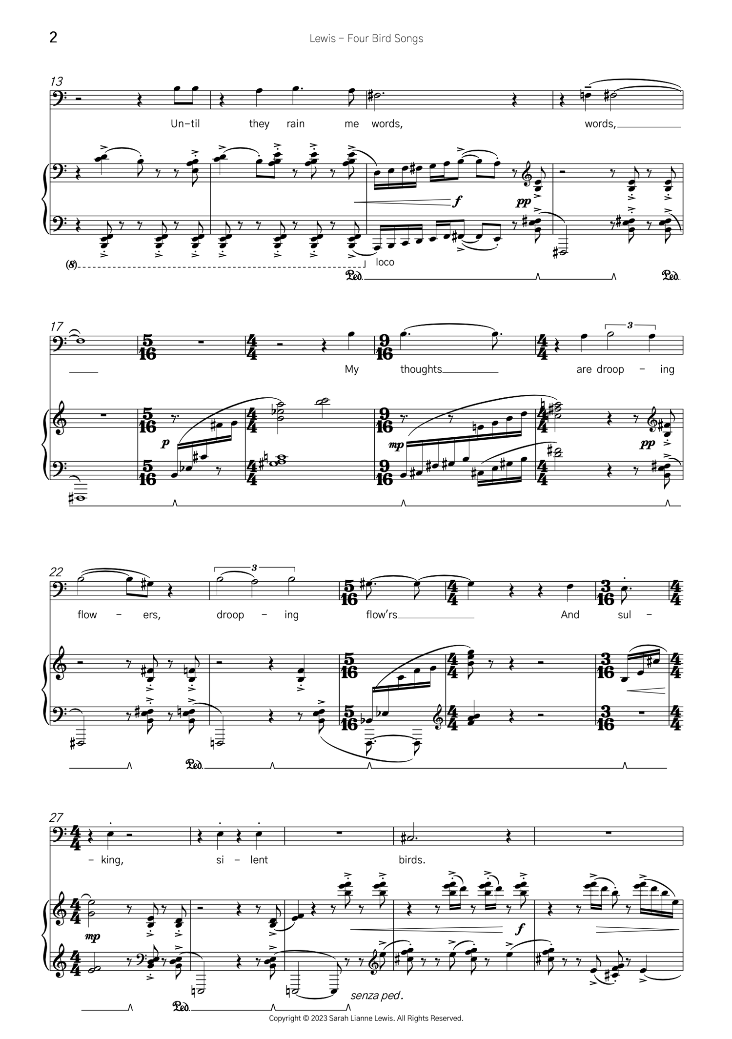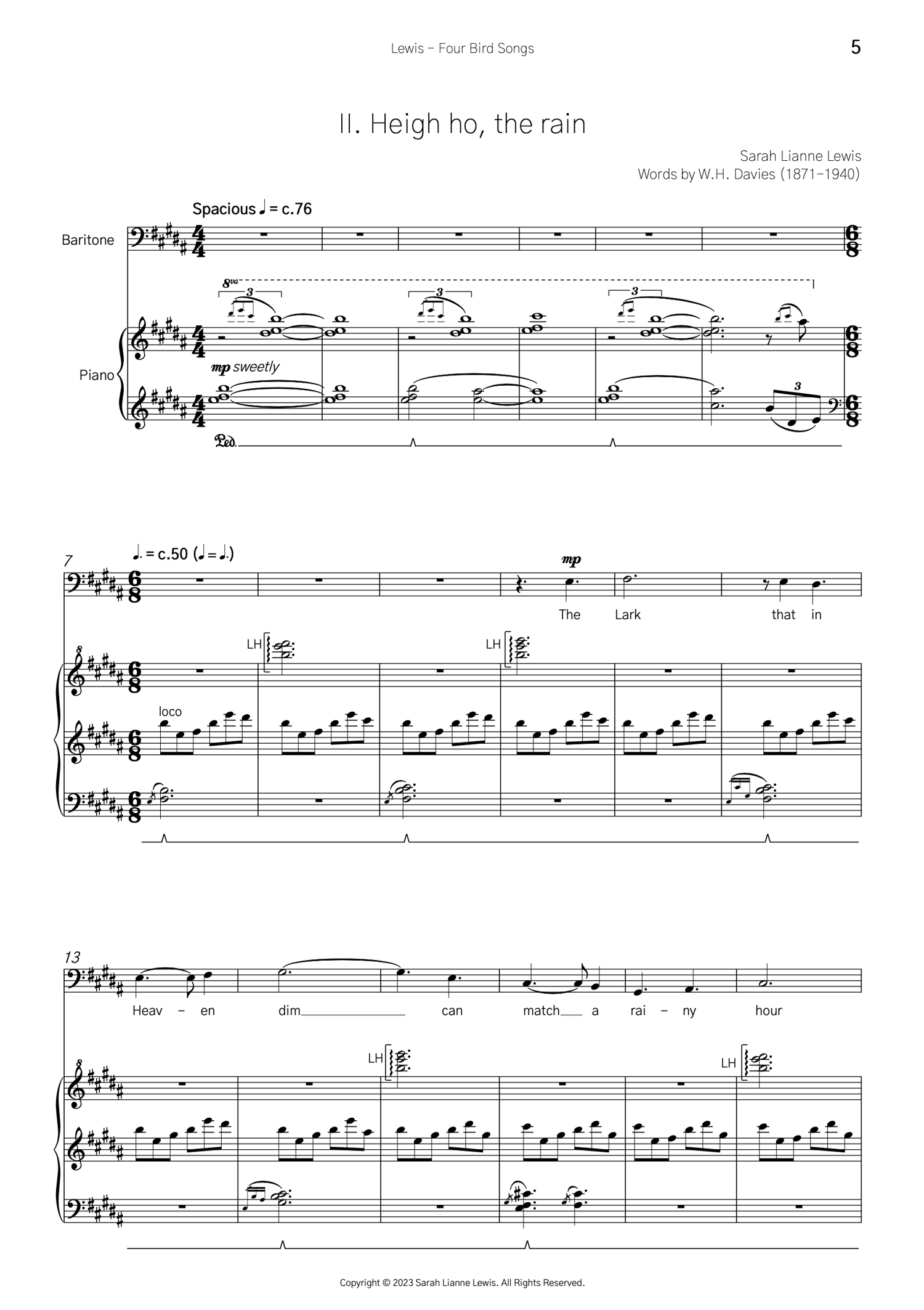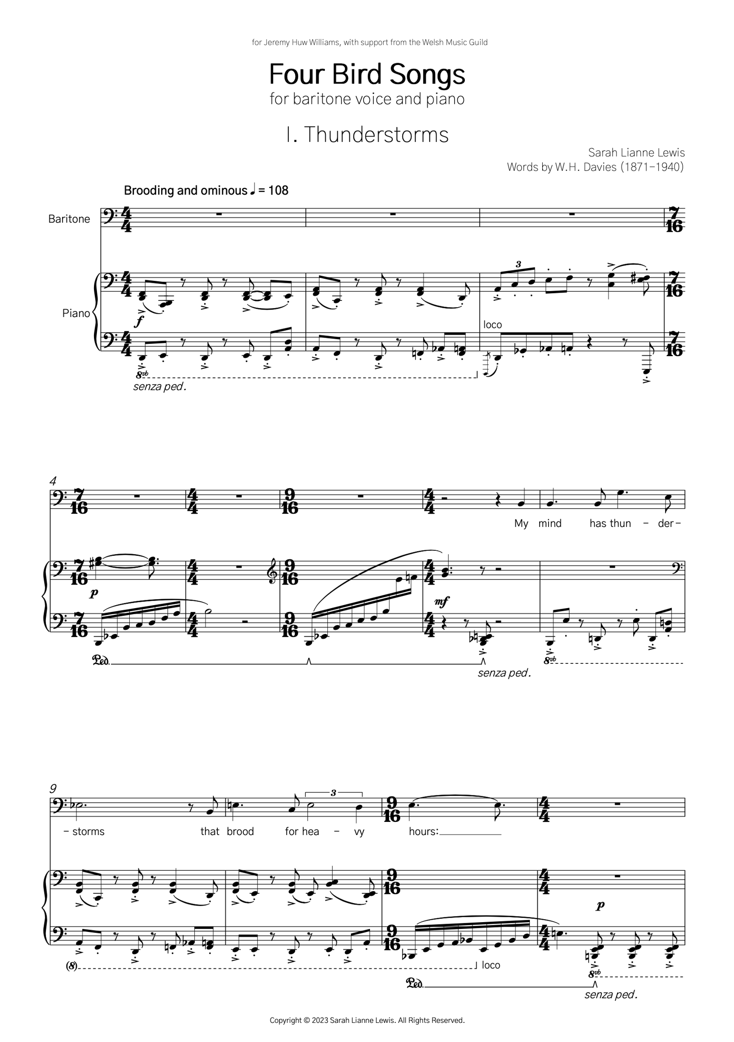 ‘Four Bird Songs’ uses W.H. Davies’ poetry to explore the ways we view our place in the natural world. Davies’ poems extol the simple beauty of nature and its inhabitants, with humour and keen observation. It is the smaller moments that he appreciates in his words; the colours of a bird’s wing, the texture of the leaves in the rain, the oppressive nature of an impending thunderstorm. In direct opposition to his appreciation of birds and nature, he writes of the human desire to explore the skies - the early aeronauts and aviators described at the time as ‘bird-men’ - and the joys and perils that await there.-------