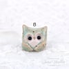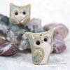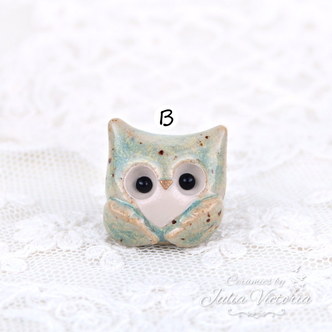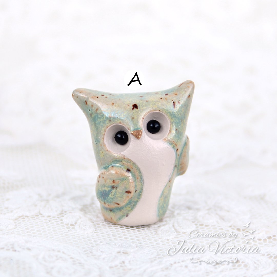These little owls are looking for new homes. They are hand-sculpted in ceramics, glazed and painted by me. The glaze is homemade and I call it 'Raw Prasiolite'