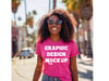 African American Woman Smiling Wearing Pink T-shirt Mockup and Sunglasses Digital Download with Sunny California Background, Design Mocks, Pink T-shirts