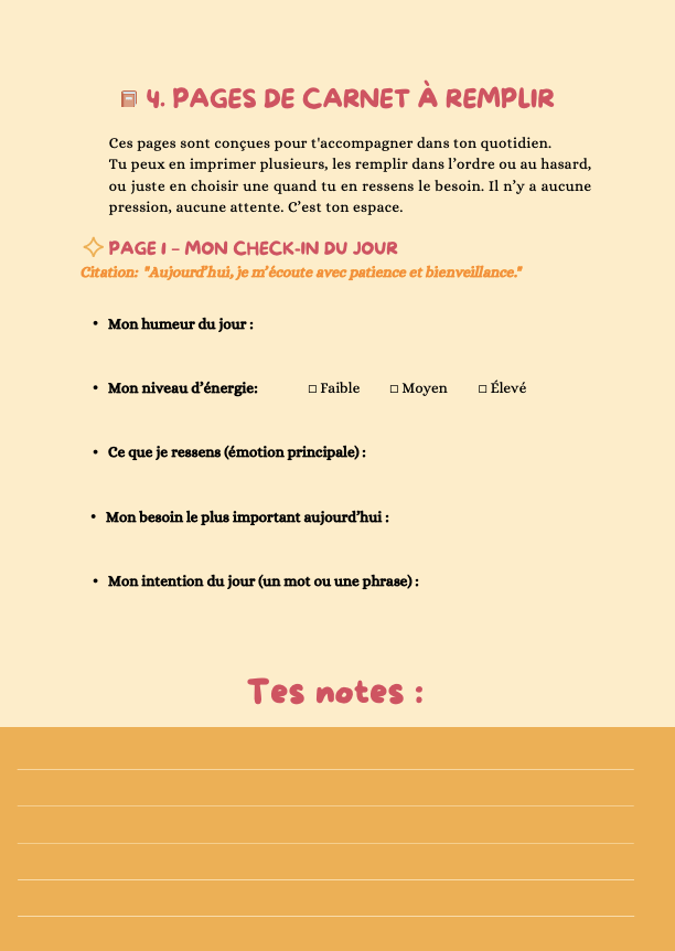 - Des espaces où vous pouvez noter vos réflexions et expériences, pour vous approprier pleinement le guide et le personnaliser à votre rythme