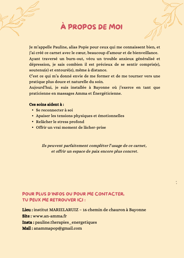 Inspiré de mon parcours personnel, ce guide a été conçu pour partager des méthodes concrètes et douces permettant de retrouver calme et sérénité au quotidien.